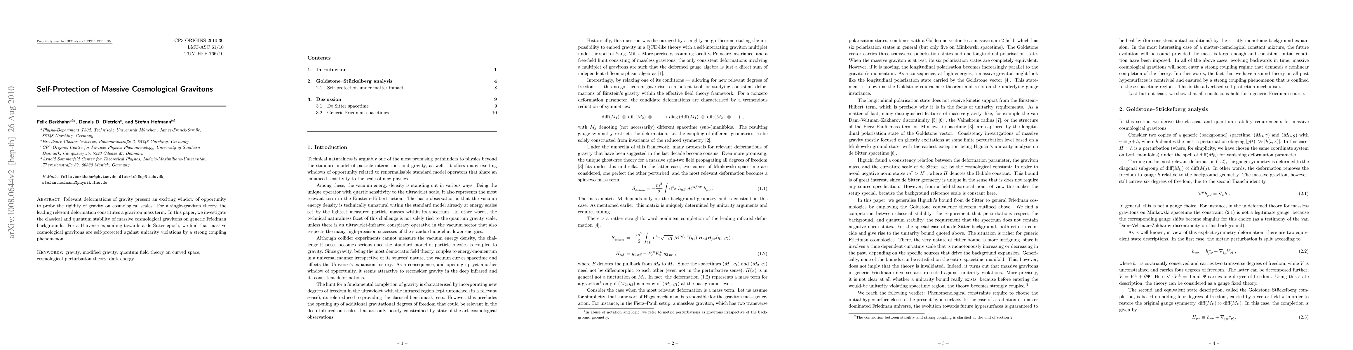 Relevant deformations of gravity present an exciting window of opportunity to probe the rigidity of gravity on cosmological scales. For a single-graviton theory, the leading relevant deformation constitutes a graviton mass term. In this paper, we investigate the classical and quantum stability of massive cosmological gravitons on generic Friedman backgrounds. For a Universe expanding towards a de Sitter epoch, we find that massive cosmological gravitons are self-protected against unitarity violations by a strong coupling phenomenon.