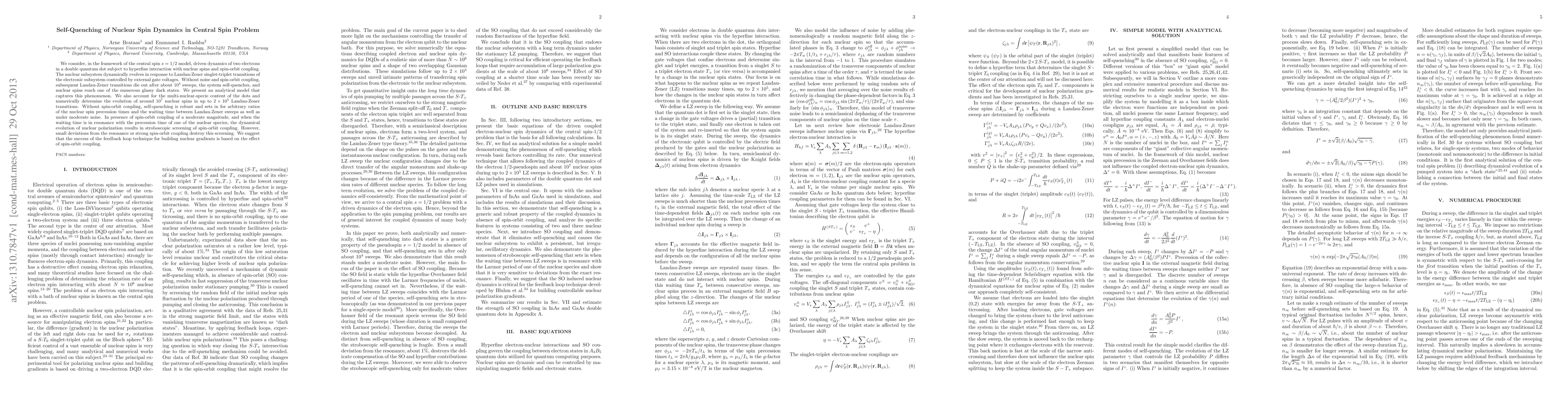 We consider, in the framework of the central spin $s=1/2$ model, driven dynamics of two electrons in a double quantum dot subject to hyperfine interaction with nuclear spins and spin-orbit coupling. The nuclear subsystem dynamically evolves in response to Landau-Zener singlet-triplet transitions of the electronic subsystem controlled by external gate voltages. Without noise and spin-orbit coupling, subsequent Landau-Zener transitions die out after about $10^4$ sweeps, the system self-quenches, and nuclear spins reach one of the numerous glassy dark states. We present an analytical model that captures this phenomenon. We also account for the multi-nuclear-specie content of the dots and numerically determine the evolution of around $10^7$ nuclear spins in up to $2\times10^5$ Landau-Zener transitions. Without spin-orbit coupling, self-quenching is robust and sets in for arbitrary ratios of the nuclear spin precession times and the waiting time between Landau-Zener sweeps as well as under moderate noise. In presence of spin-orbit coupling of a moderate magnitude, and when the waiting time is in resonance with the precession time of one of the nuclear species, the dynamical evolution of nuclear polarization results in stroboscopic screening of spin-orbit coupling. However, small deviations from the resonance or strong spin-orbit coupling destroy this screening. We suggest that the success of the feedback loop technique for building nuclear gradients is based on the effect of spin-orbit coupling.