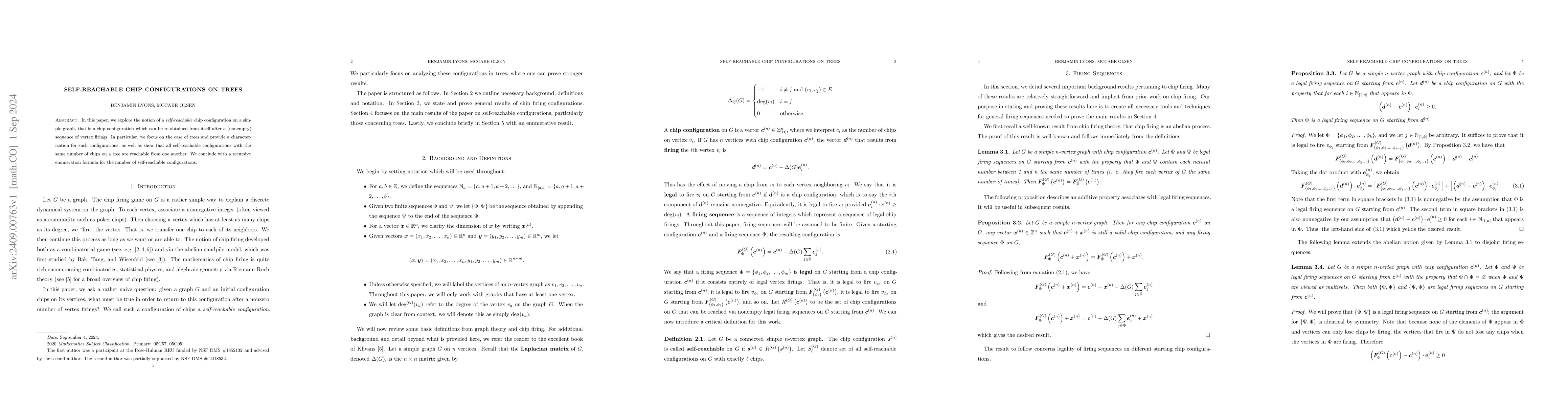 This paper characterizes self-reachable chip configurations on trees, showing that all configurations with the same chip count are mutually reachable via vertex firings, and provides a recursive formula for enumerating such configurations.