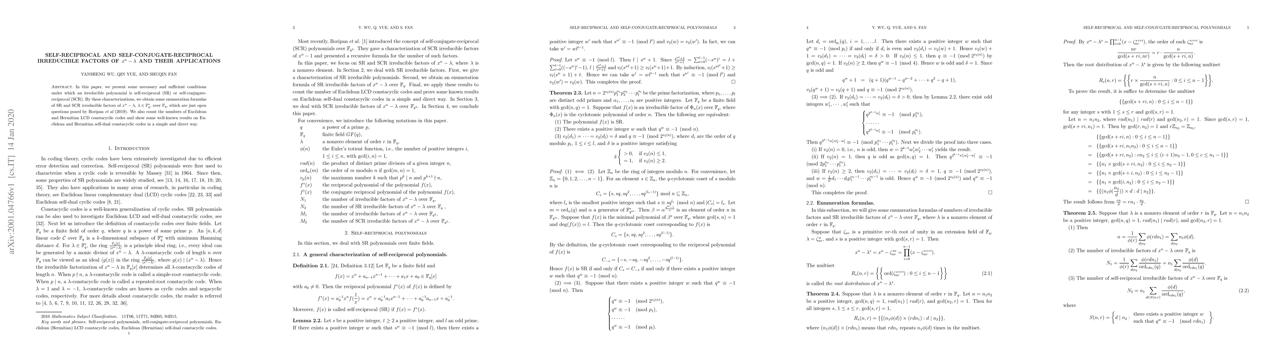 This paper presents necessary and sufficient conditions for irreducible polynomials to be self-reciprocal or self-conjugate-reciprocal, providing new enumeration formulas and counting results for related codes.