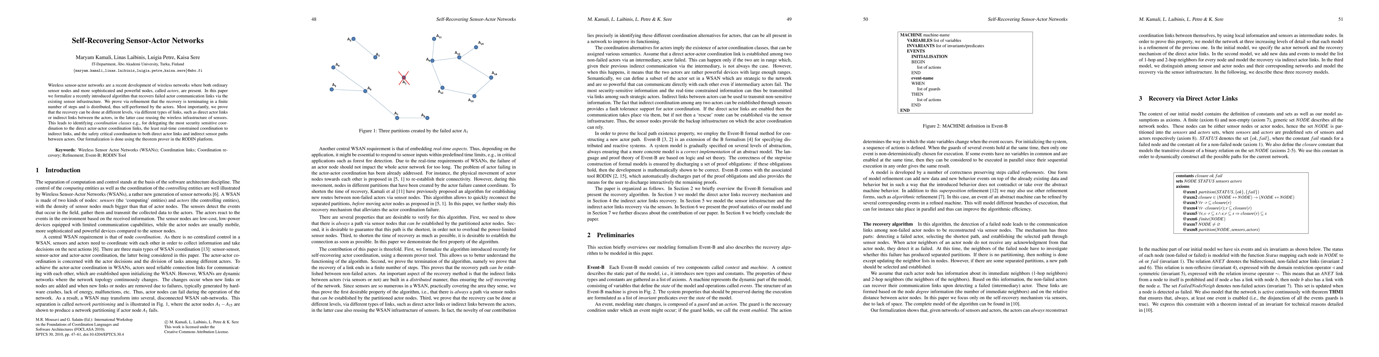 This paper formalizes an algorithm for self-recovery in wireless sensor-actor networks, ensuring failed actor communication links are repaired via the existing sensor infrastructure. The recovery process is proven to be terminating, distributed, and adaptable to different levels and types of links, facilitating various coordination classes for security, real-time, and safety-critical tasks. Formal proofs are conducted using the RODIN platform.