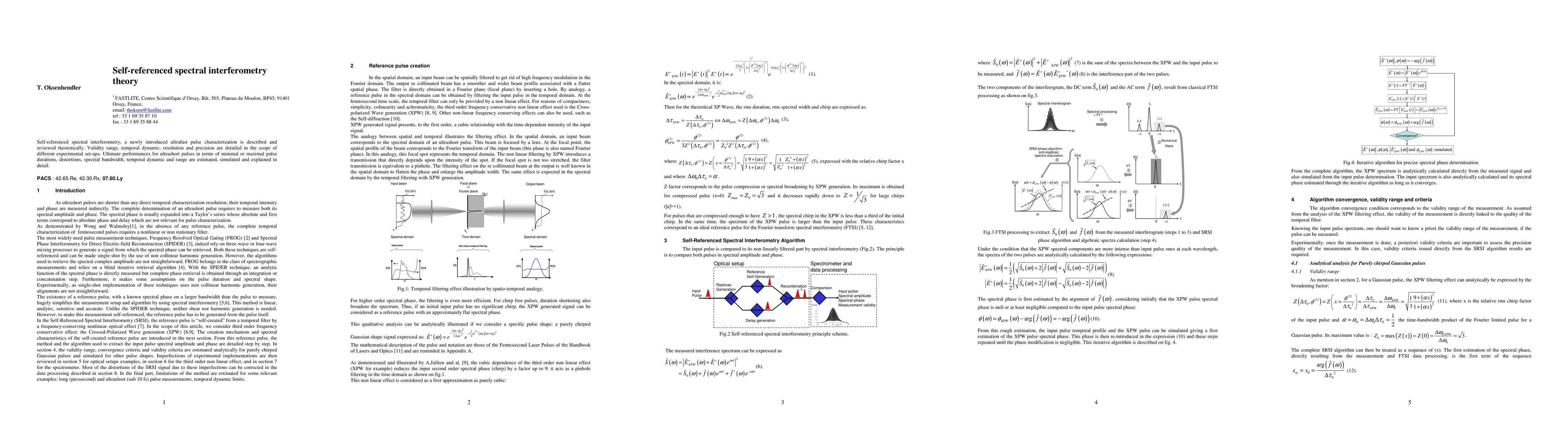 Self-referenced spectral interferometry, a newly introduced ultrafast pulse characterization is described and reviewed theoretically. Validity range, temporal dynamic, resolution and precision are detailed in the scope of different experimental set-ups. Ultimate performances for ultrashort pulses in terms of minimal or maximal pulse durations, distortions, spectral bandwidth, temporal dynamic and range are estimated, simulated and explained in detail.