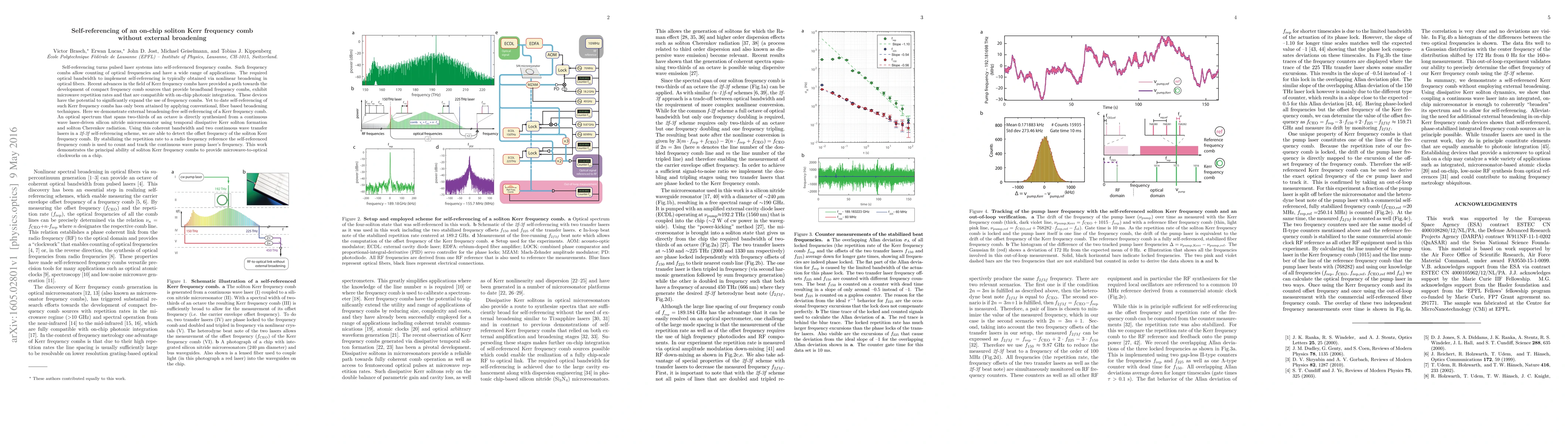 This paper demonstrates self-referencing of an on-chip soliton Kerr frequency comb without external broadening, using temporal soliton formation and Cherenkov radiation in a silicon nitride microresonator to generate a broadband spectrum. The self-referenced comb is stabilized for precise frequency counting and tracking.