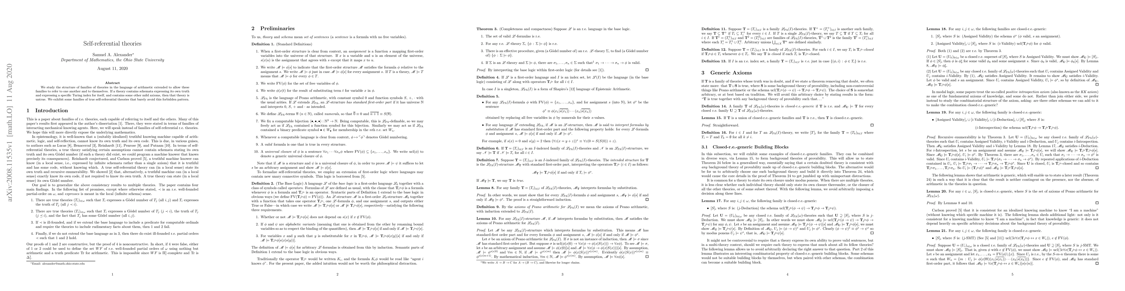 Researchers found that certain self-referential theories in mathematics lead to contradictions when they contain schemata expressing their own truth and a specific Turing index for themselves. They also discovered some families of true self-referential theories that avoid this pattern.