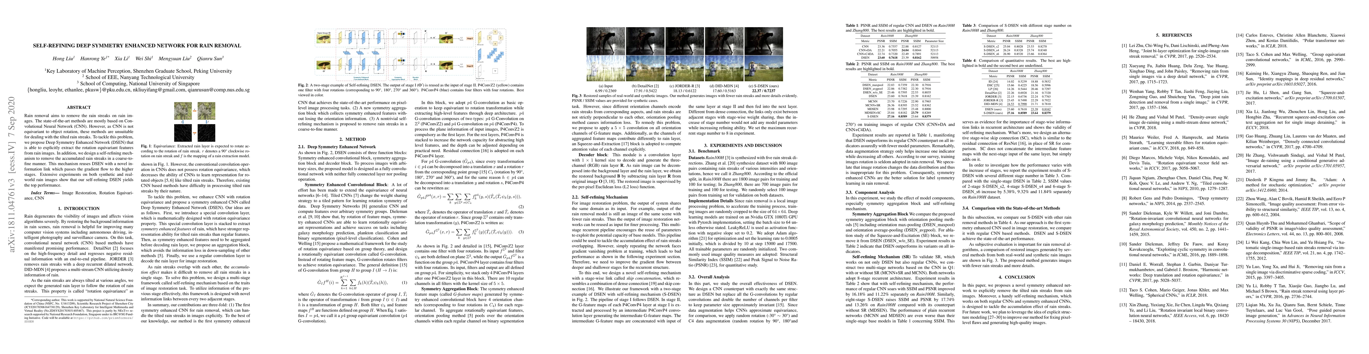 The paper proposes a Deep Symmetry Enhanced Network (DSEN) for rain removal that extracts rotation equivariant features to handle tilted rain streaks effectively. It incorporates a self-refining mechanism to progressively remove rain streaks, achieving superior performance on both synthetic and real rain images.