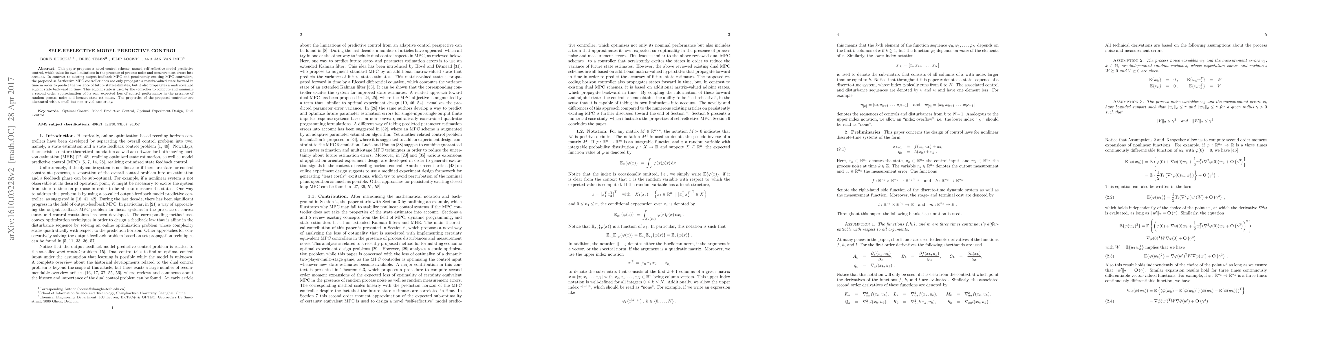 A new control scheme called self-reflective model predictive control is proposed to account for process noise and measurement errors in real-time control systems. It uses an adjoint state to estimate the controller's expected loss of performance, leading to improved control performance under uncertainty.