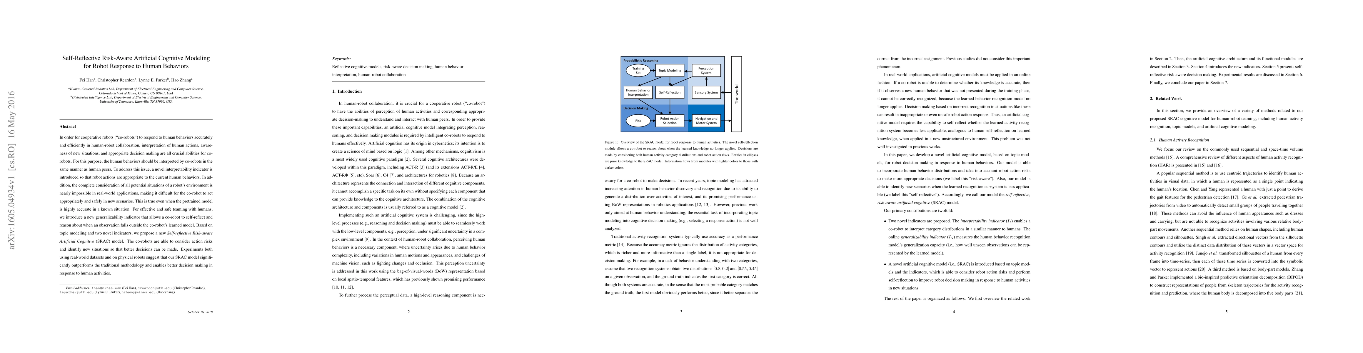 In order for cooperative robots ("co-robots") to respond to human behaviors accurately and efficiently in human-robot collaboration, interpretation of human actions, awareness of new situations, and appropriate decision making are all crucial abilities for co-robots. For this purpose, the human behaviors should be interpreted by co-robots in the same manner as human peers. To address this issue, a novel interpretability indicator is introduced so that robot actions are appropriate to the current human behaviors. In addition, the complete consideration of all potential situations of a robot's environment is nearly impossible in real-world applications, making it difficult for the co-robot to act appropriately and safely in new scenarios. This is true even when the pretrained model is highly accurate in a known situation. For effective and safe teaming with humans, we introduce a new generalizability indicator that allows a co-robot to self-reflect and reason about when an observation falls outside the co-robot's learned model. Based on topic modeling and two novel indicators, we propose a new Self-reflective Risk-aware Artificial Cognitive (SRAC) model. The co-robots are able to consider action risks and identify new situations so that better decisions can be made. Experiments both using real-world datasets and on physical robots suggest that our SRAC model significantly outperforms the traditional methodology and enables better decision making in response to human activities.