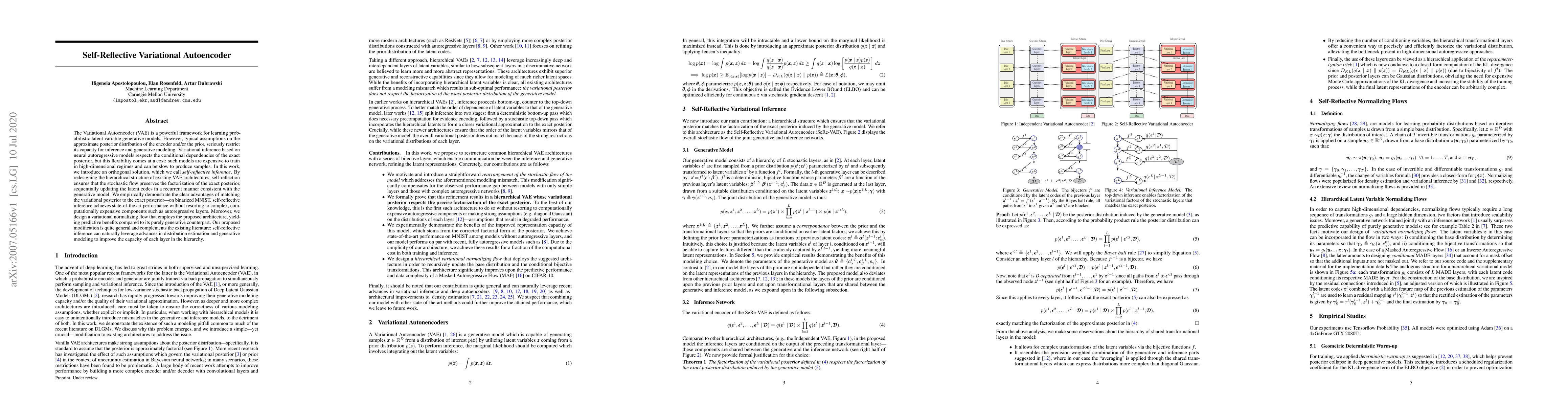 The Variational Autoencoder (VAE) is a powerful framework for learning probabilistic latent variable generative models. However, typical assumptions on the approximate posterior distribution of the encoder and/or the prior, seriously restrict its capacity for inference and generative modeling. Variational inference based on neural autoregressive models respects the conditional dependencies of the exact posterior, but this flexibility comes at a cost: such models are expensive to train in high-dimensional regimes and can be slow to produce samples. In this work, we introduce an orthogonal solution, which we call self-reflective inference. By redesigning the hierarchical structure of existing VAE architectures, self-reflection ensures that the stochastic flow preserves the factorization of the exact posterior, sequentially updating the latent codes in a recurrent manner consistent with the generative model. We empirically demonstrate the clear advantages of matching the variational posterior to the exact posterior - on binarized MNIST, self-reflective inference achieves state-of-the art performance without resorting to complex, computationally expensive components such as autoregressive layers. Moreover, we design a variational normalizing flow that employs the proposed architecture, yielding predictive benefits compared to its purely generative counterpart. Our proposed modification is quite general and complements the existing literature; self-reflective inference can naturally leverage advances in distribution estimation and generative modeling to improve the capacity of each layer in the hierarchy.