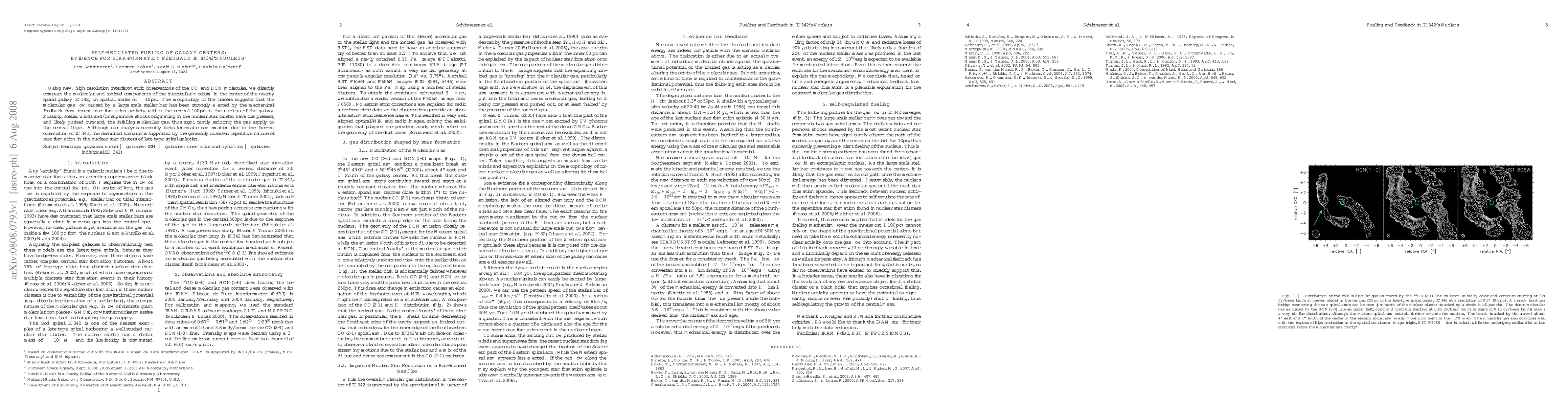 Using new, high-resolution interferometric observations of the CO and HCN molecules, we directly compare the molecular and ionized components of the interstellar medium in the center of the nearby spiral galaxy IC342, on spatial scales of ~ 10pc. The morphology of the tracers suggests that the molecular gas flow caused by a large-scale stellar bar has been strongly affected by the mechanical feedback from recent star formation activity within the central 100pc in the nucleus of the galaxy. Possibly, stellar winds and/or supernova shocks originating in the nuclear star cluster have compressed, and likely pushed outward, the infalling molecular gas, thus significantly reducing the gas supply to the central 10pc. Although our analysis currently lacks kinematic confirmation due to the face-on orientation of IC342, the described scenario is supported by the generally observed repetitive nature of star formation in the nuclear star clusters of late-type spiral galaxies.