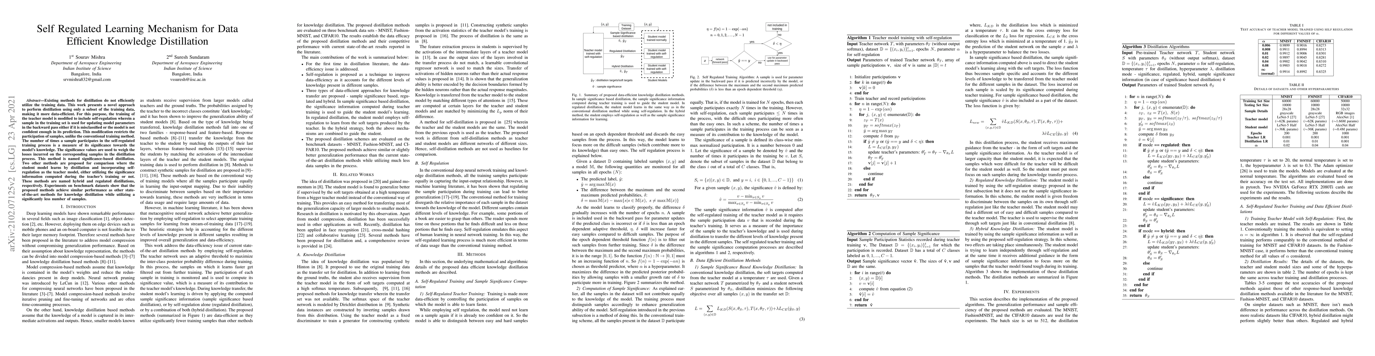 This paper introduces a self-regulated learning mechanism for data-efficient knowledge distillation, employing a subset of training data to enhance efficiency. The proposed significance-based distillation method uses the significance of samples in teacher model training to weigh losses during distillation, achieving comparable performance with fewer samples.