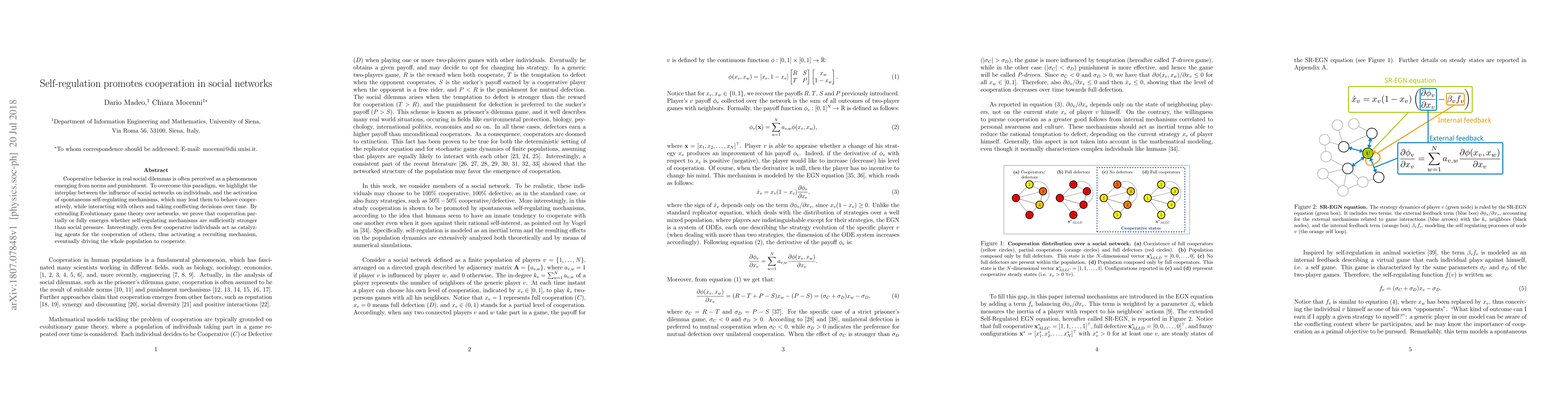 This paper demonstrates that self-regulation can promote cooperation in social networks, showing that cooperative behavior emerges when self-regulating mechanisms are stronger than social pressure. Even a few cooperative individuals can catalyze broader cooperation, illustrating a recruiting mechanism that drives the entire population to cooperate.