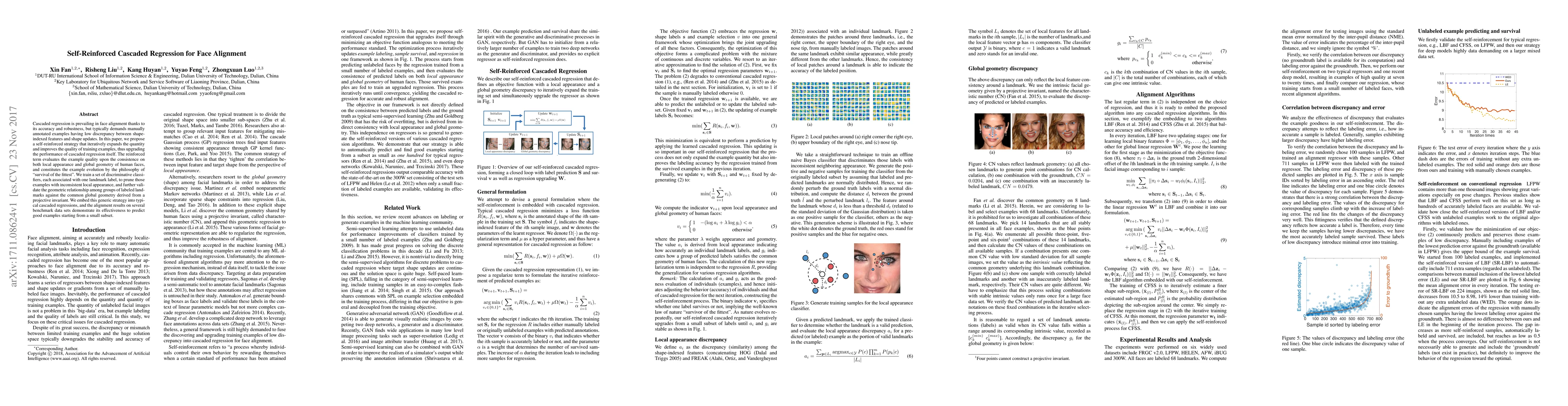 This paper proposes a self-reinforced cascaded regression method for face alignment that iteratively enhances training examples by evaluating their consistency in local appearance and global geometry, leading to improved performance. The method employs discriminative classifiers to prune inconsistent examples and validates landmark relationships against a projective invariant, ultimately demonstrating effective alignment starting from a small initial subset.