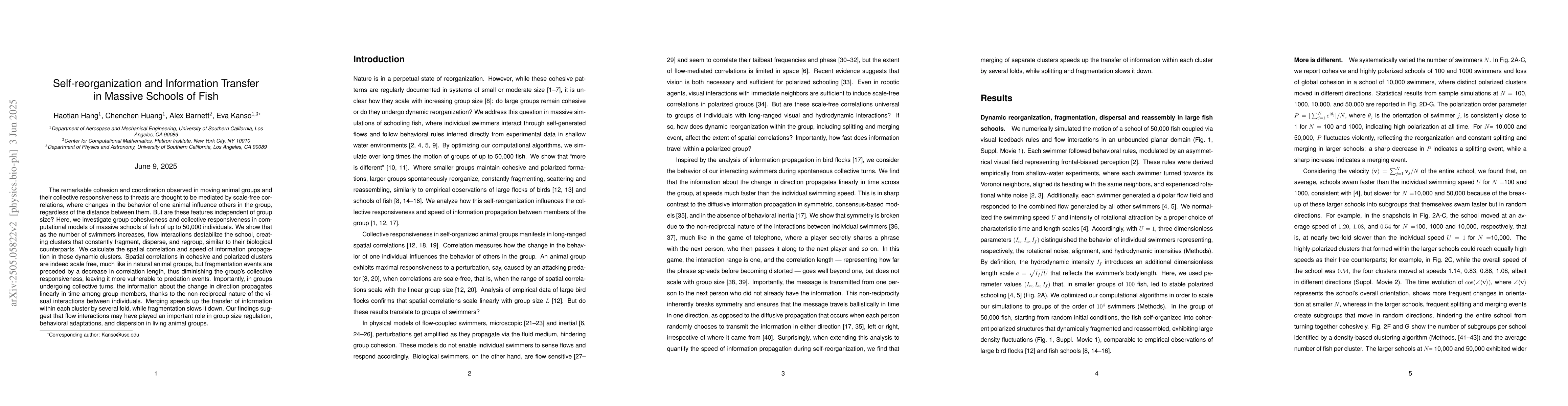 The paper presents a novel analysis of spatial correlation and speed of information propagation in dynamic clusters within massive schools of fish, highlighting the role of flow interactions in shaping group behavior.