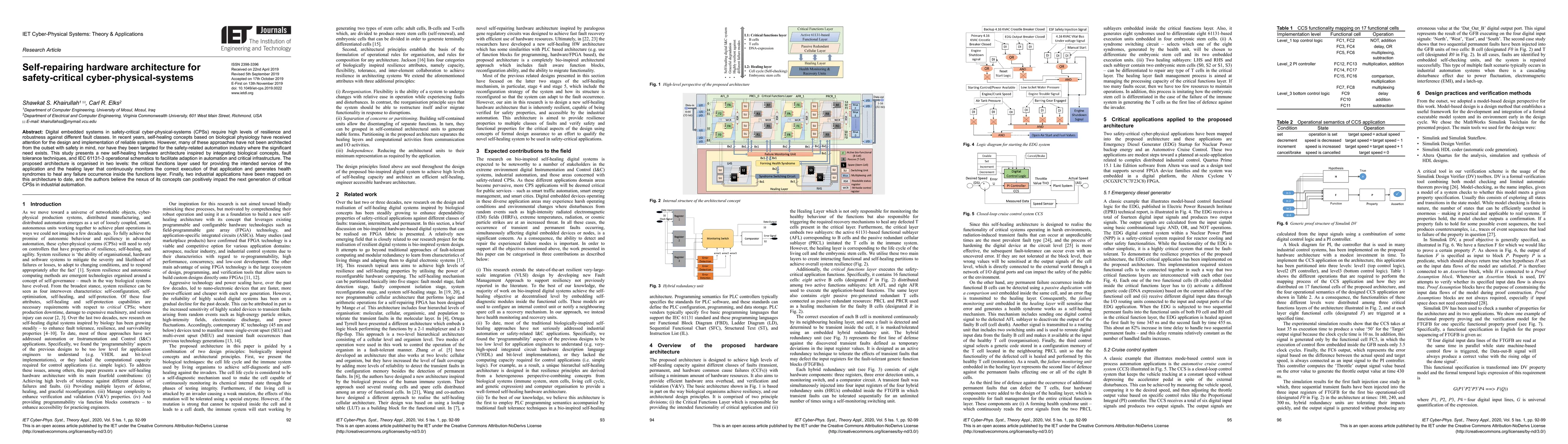This paper introduces a self-repairing hardware architecture for safety-critical cyber-physical systems, combining biological self-healing concepts with fault tolerance techniques and IEC 61131-3 standards. The architecture features two layers: a critical functions layer and a healing layer that monitors and repairs failures, aiming to enhance resilience in industrial automation.
