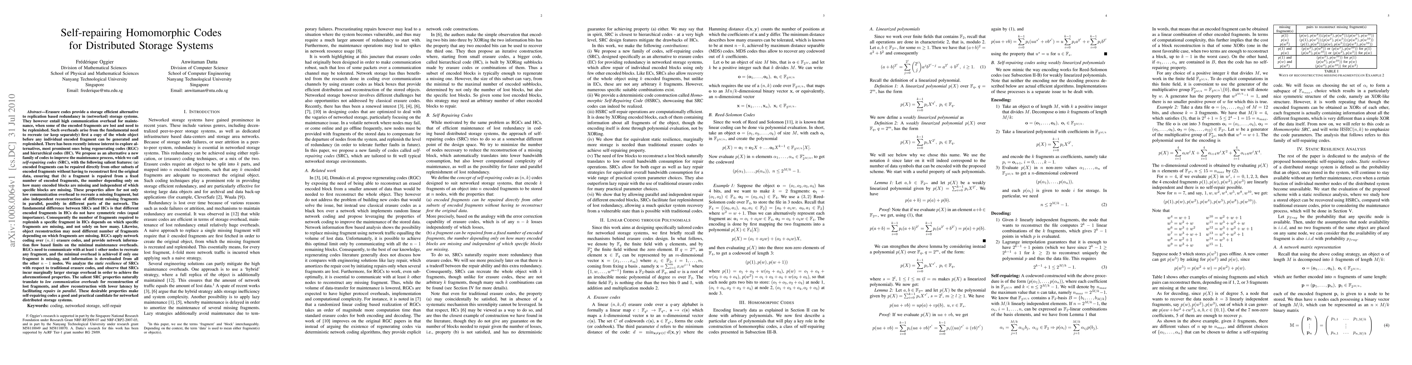 This paper proposes self-repairing homomorphic codes (SRC) to reduce maintenance overhead in distributed storage systems compared to traditional erasure codes. SRC allows direct repair of encoded fragments from other fragments, enabling low communication costs, parallel repairs, and marginal increase in storage overhead.