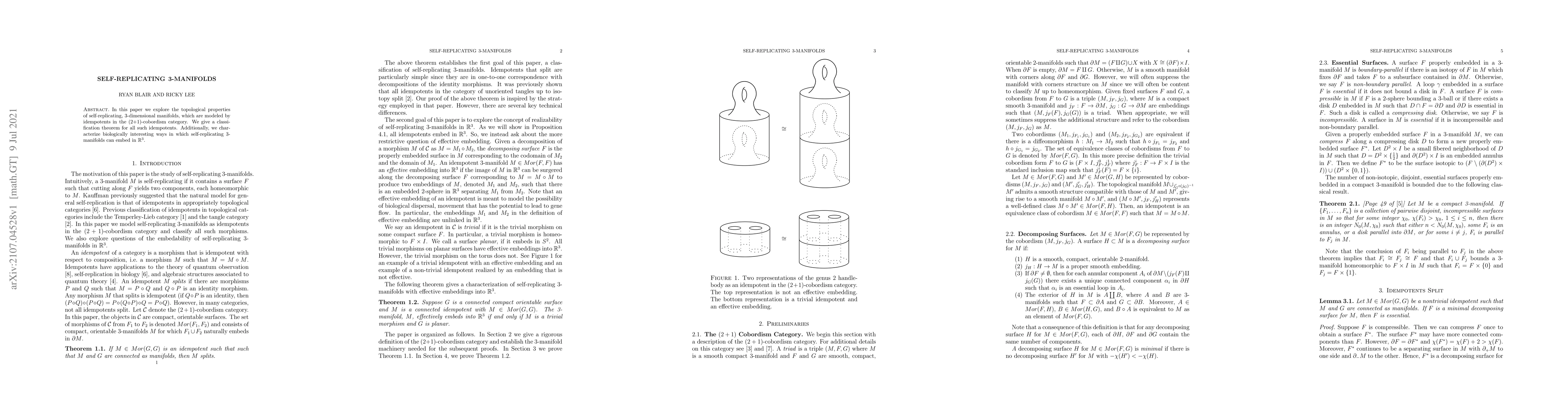 This paper classifies self-replicating 3-dimensional manifolds using idempotents in the (2+1)-cobordism category and explores their topological properties, while also detailing how such manifolds can be embedded in $\mathbb{R}^3$ in biologically relevant ways.