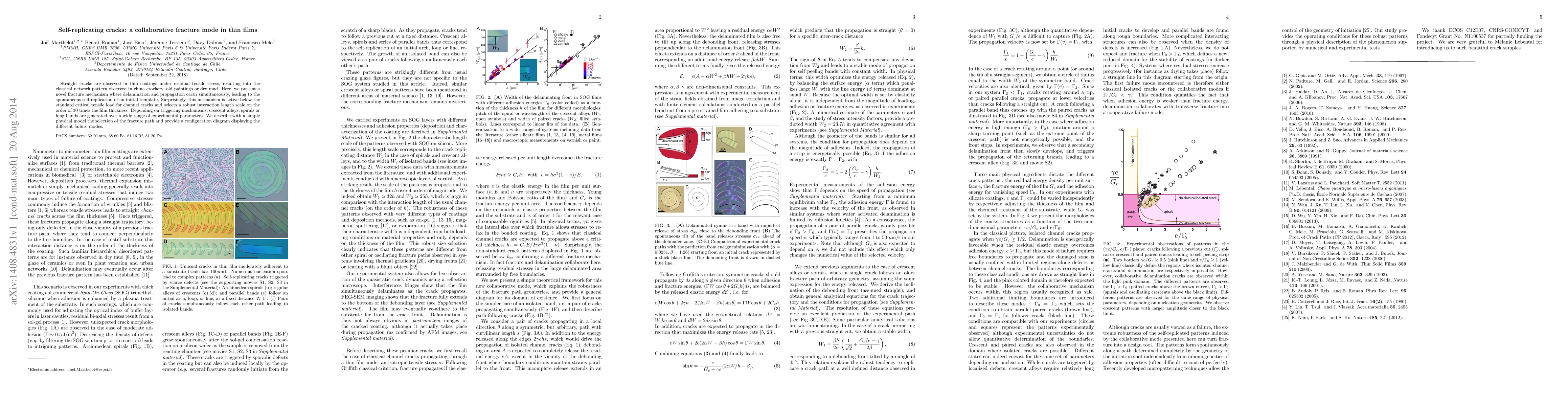 Straight cracks are observed in thin coatings under residual tensile stress, resulting into the classical network pattern observed in china crockery, old paintings or dry mud. Here, we present a novel fracture mechanism where delamination and propagation occur simultaneously, leading to the spontaneous self-replication of an initial template. Surprisingly, this mechanism is active below the standard critical tensile load for channel cracks and selects a robust interaction length scale on the order of 30 times the film thickness. Depending on triggering mechanisms, crescent alleys, spirals or long bands are generated over a wide range of experimental parameters. We describe with a simple physical model the selection of the fracture path and provide a configuration diagram displaying the different failure modes.