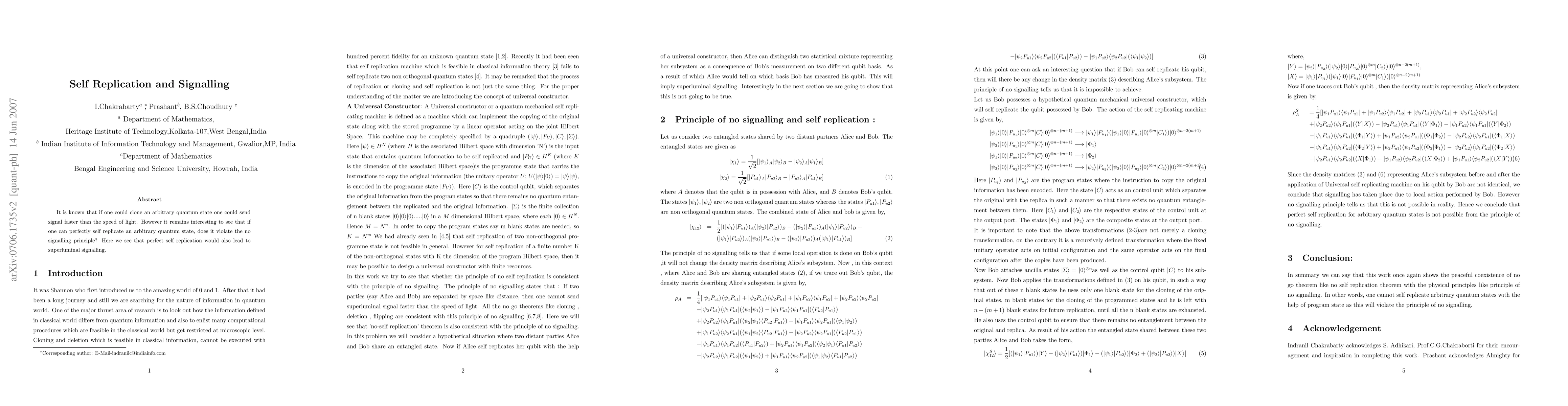 It is known that if one could clone an arbitrary quantum state one could send signal faster than the speed of light. However it remains interesting to see that if one can perfectly self replicate an arbitrary quantum state, does it violate the no signalling principle? Here we see that perfect self replication would also lead to superluminal signalling.