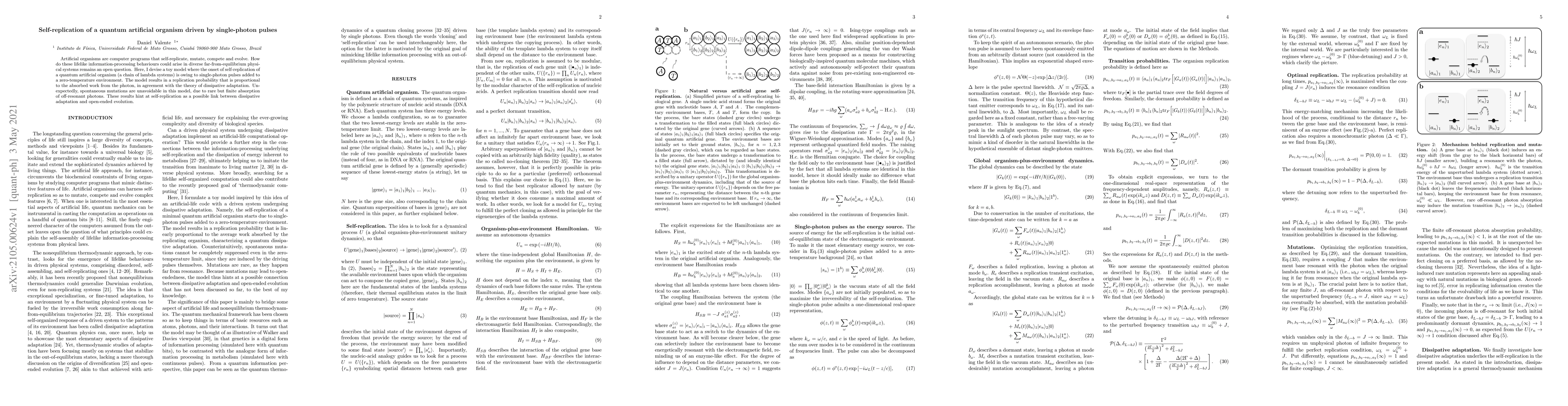 A new model shows how quantum artificial organisms can self-replicate using single-photon pulses in a zero-temperature environment, with replication probability linked to absorbed work from photons. This research hints at a connection between self-replication and dissipative adaptation in open-ended evolution.