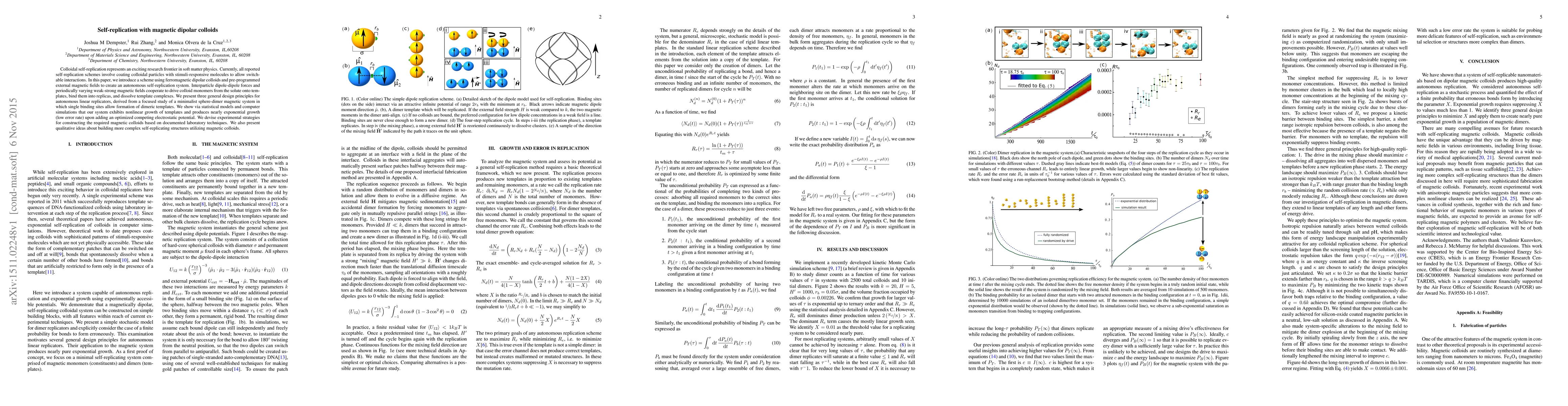 This paper presents a self-replication scheme using ferromagnetic dipolar colloids and external magnetic fields, demonstrating autonomous replication through interparticle forces and magnetic field variations. The study proposes three design principles for linear replicators and shows nearly exponential growth via simulations and statistical models.