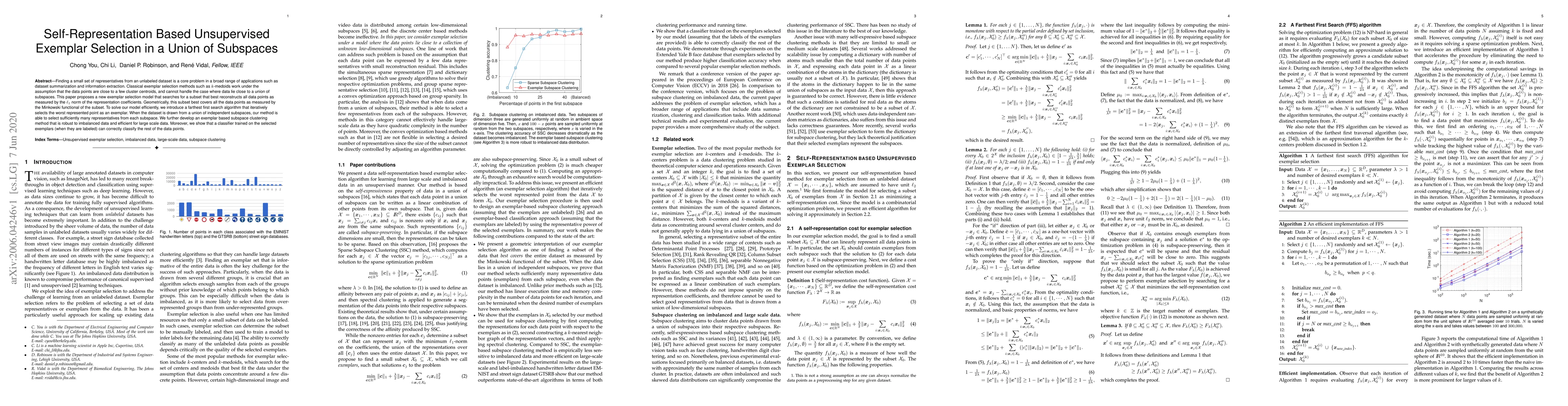 The paper introduces a self-representation based unsupervised exemplar selection model and an efficient farthest first search algorithm to solve the optimization problem, along with an exemplar-based subspace clustering method.