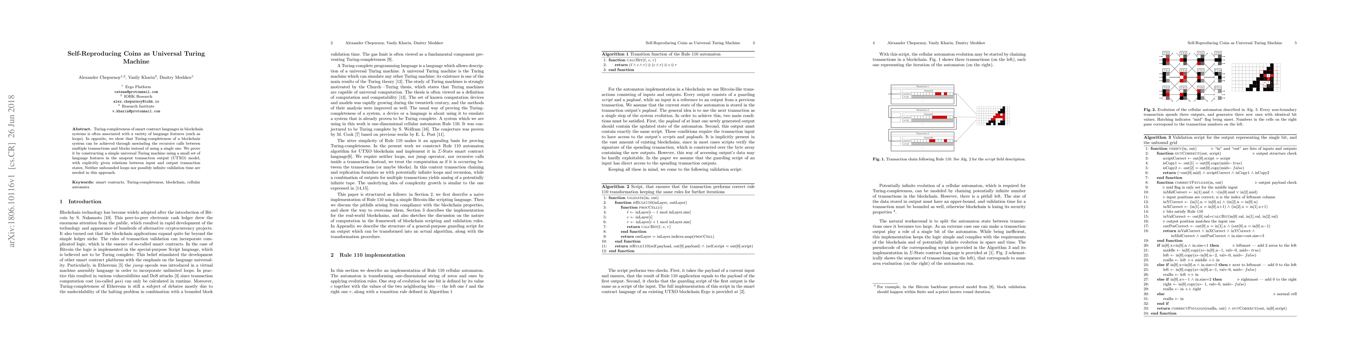 The research demonstrates Turing-completeness of a blockchain system using the UTXO model, constructing a simple universal Turing machine through transaction chaining without relying on unbounded loops or infinite validation time.