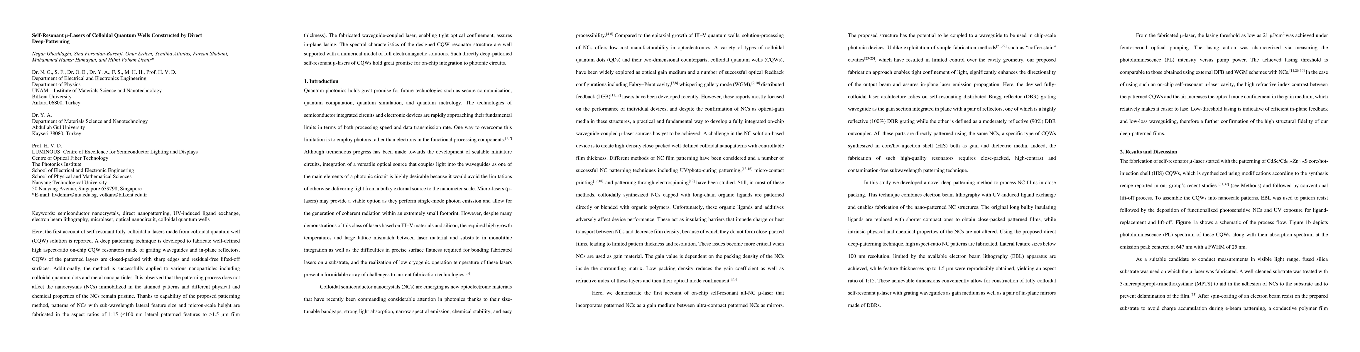 Here, the first account of self-resonant fully-colloidal u-lasers made from colloidal quantum well (CQW) solution is reported. A deep patterning technique is developed to fabricate well-defined high aspect-ratio on-chip CQW resonators made of grating waveguides and in-plane reflectors. CQWs of the patterned layers are closed-packed with sharp edges and residual-free lifted-off surfaces. Additionally, the method is successfully applied to various nanoparticles including colloidal quantum dots and metal nanoparticles. It is observed that the patterning process does not affect the nanocrystals (NCs) immobilized in the attained patterns and different physical and chemical properties of the NCs remain pristine. Thanks to capability of the proposed patterning method, patterns of NCs with sub-wavelength lateral feature size and micron-scale height are fabricated in the aspect ratios of 1:15 (<100 nm lateral patterned features to >1.5 {\mu}m film thickness). The fabricated waveguide-coupled laser, enabling tight optical confinement, assures in-plane lasing. The spectral characteristics of the designed CQW resonator structure are well supported with a numerical model of full electromagnetic solutions. Such directly deep-patterned self-resonant u-lasers of CQWs hold great promise for on-chip integration to photonic circuits.