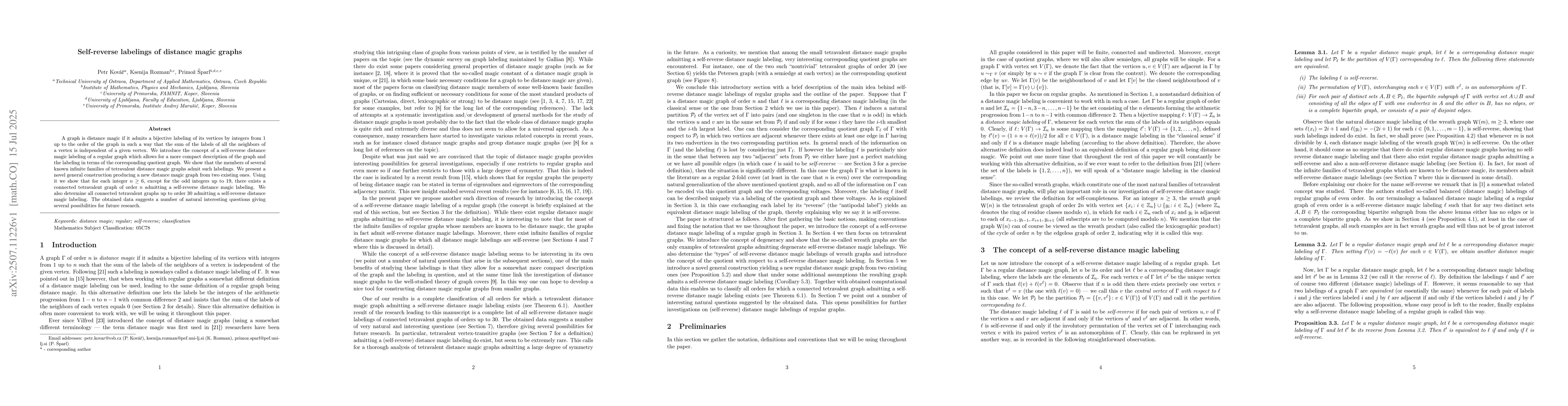 A graph is distance magic if it admits a bijective labeling of its vertices by integers from $1$ up to the order of the graph in such a way that the sum of the labels of all the neighbors of a vertex is independent of a given vertex. We introduce the concept of a self-reverse distance magic labeling of a regular graph which allows for a more compact description of the graph and the labeling in terms of the corresponding quotient graph. We show that the members of several known infinite families of tetravalent distance magic graphs admit such labelings. We present a novel general construction producing a new distance magic graph from two existing ones. Using it we show that for each integer $n \geq 6$, except for the odd integers up to $19$, there exists a connected tetravalent graph of order $n$ admitting a self-reverse distance magic labeling. We also determine all connected tetravalent graphs up to order $30$ admitting a self-reverse distance magic labeling. The obtained data suggests a number of natural interesting questions giving several possibilities for future research.