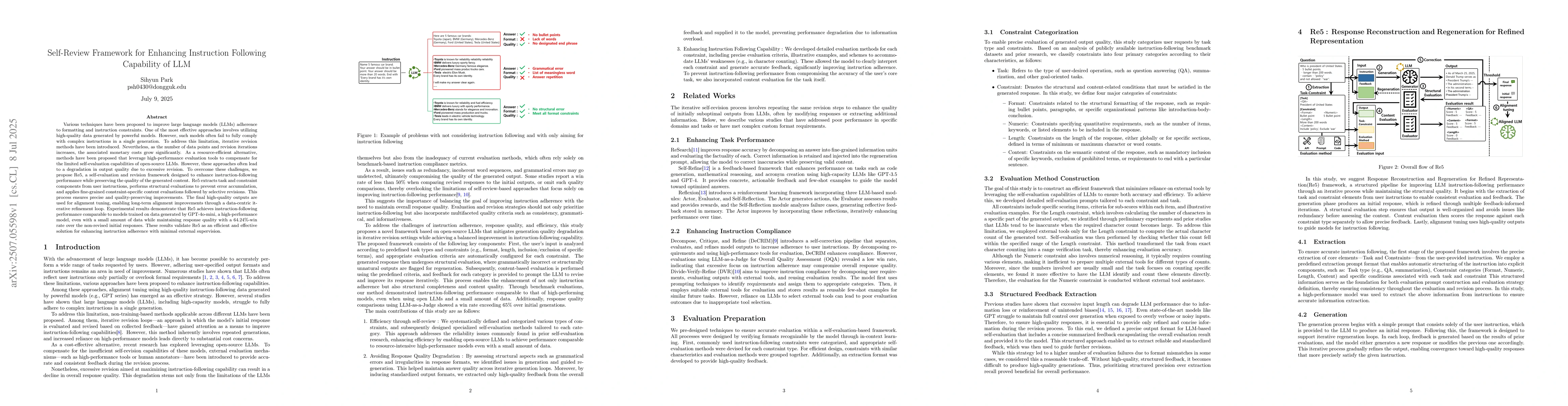 Various techniques have been proposed to improve large language models (LLMs) adherence to formatting and instruction constraints. One of the most effective approaches involves utilizing high-quality data generated by powerful models. However, such models often fail to fully comply with complex instructions in a single generation. To address this limitation, iterative revision methods have been introduced. Nevertheless, as the number of data points and revision iterations increases, the associated monetary costs grow significantly. As a resource-efficient alternative, methods have been proposed that leverage high-performance evaluation tools to compensate for the limited self-evaluation capabilities of open-source LLMs. However, these approaches often lead to a degradation in output quality due to excessive revision. To overcome these challenges, we propose Re5, a self-evaluation and revision framework designed to enhance instruction-following performance while preserving the quality of the generated content. Re5 extracts task and constraint components from user instructions, performs structural evaluations to prevent error accumulation, and applies fine-grained constraint-specific content evaluations followed by selective revisions. This process ensures precise and quality-preserving improvements. The final high-quality outputs are used for alignment tuning, enabling long-term alignment improvements through a data-centric iterative refinement loop. Experimental results demonstrate that Re5 achieves instruction-following performance comparable to models trained on data generated by GPT-4o-mini, a high-performance model, even with a small amount of data while maintaining response quality with a 64.24%-win rate over the non-revised initial responses. These results validate Re5 as an efficient and effective solution for enhancing instruction adherence with minimal external supervision.