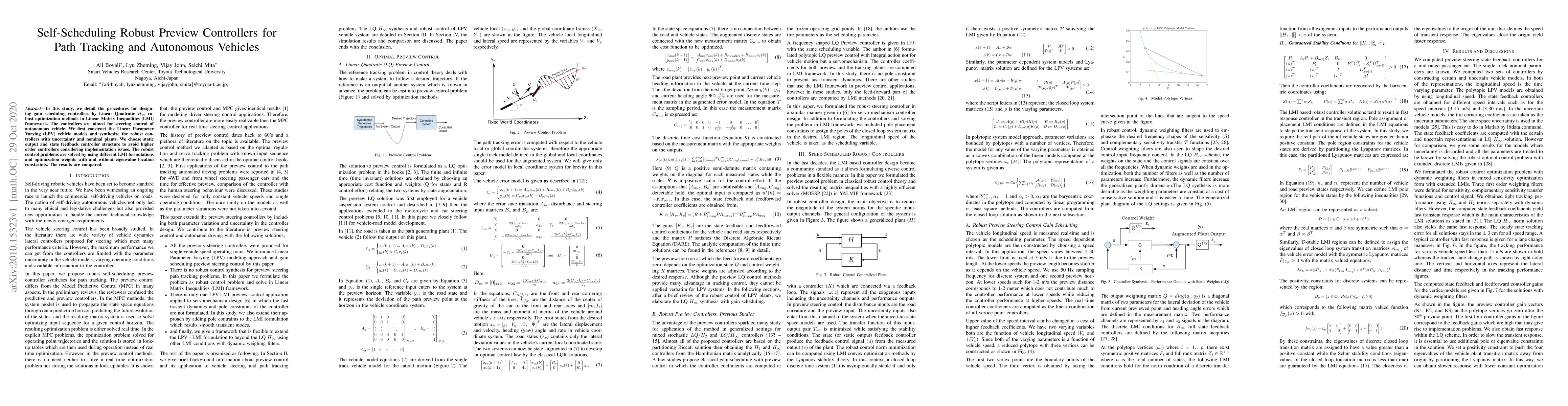 This paper designs self-scheduling robust preview controllers for autonomous vehicle path tracking using Linear Quadratic $H_\infty$ optimization within an LMI framework. The study constructs LPV models and synthesizes robust controllers to handle uncertainties, comparing results from various LMI formulations and optimization weights.