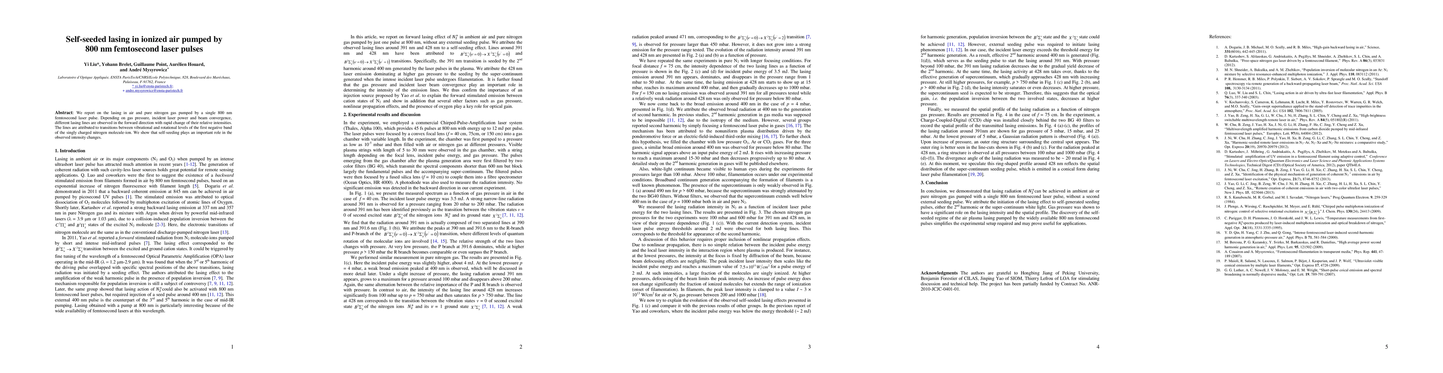 This research demonstrates lasing in ionized air and pure nitrogen gas pumped by a single 800 nm femtosecond laser pulse, revealing different lasing lines attributed to nitrogen molecule-ion transitions. The study highlights the significant role of self-seeding in the rapid changes in the relative intensities of these lines.