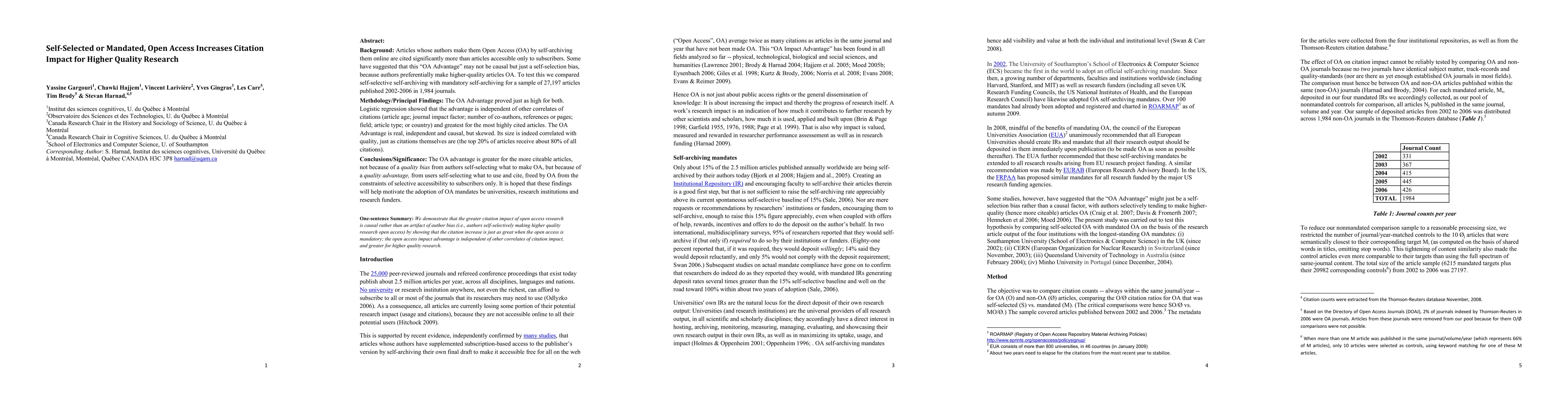 The study finds that both self-selected and mandated open access articles receive significantly higher citation impact compared to non-open access articles, demonstrating a causal "OA Advantage" independent of author selection bias. This advantage is most pronounced for the highest-quality articles, suggesting that open access enhances the visibility and usage of superior research.