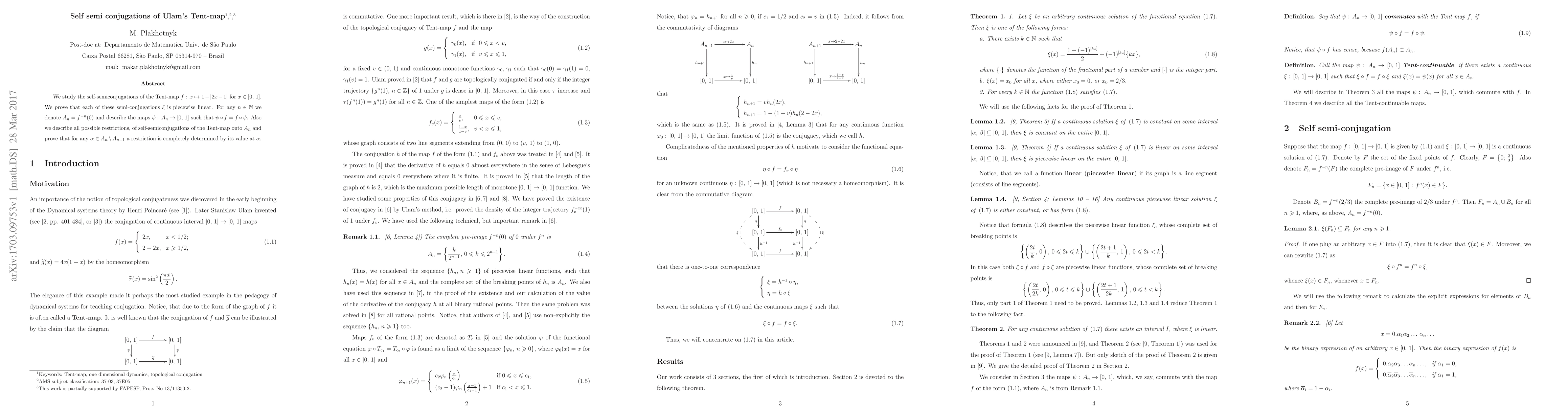 This paper investigates the self-semiconjugations of Ulam's Tent-map, proving that they are piecewise linear. It describes restrictions of these semiconjugations onto specific sets $A_n$ and shows that each restriction is uniquely determined by its value at certain points in $A_n$.