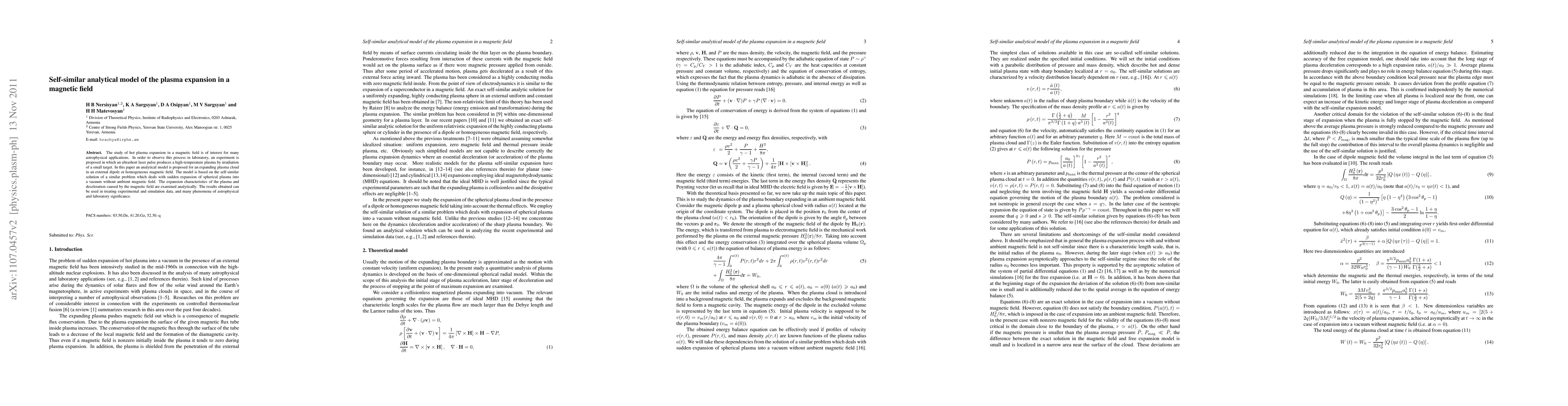 This paper proposes an analytical self-similar model for the expansion of hot plasma in a magnetic field, based on laboratory experiments using ultrashort laser pulses. The model examines the deceleration effects of the magnetic field and can aid in interpreting experimental and simulation data for astrophysical and laboratory applications.