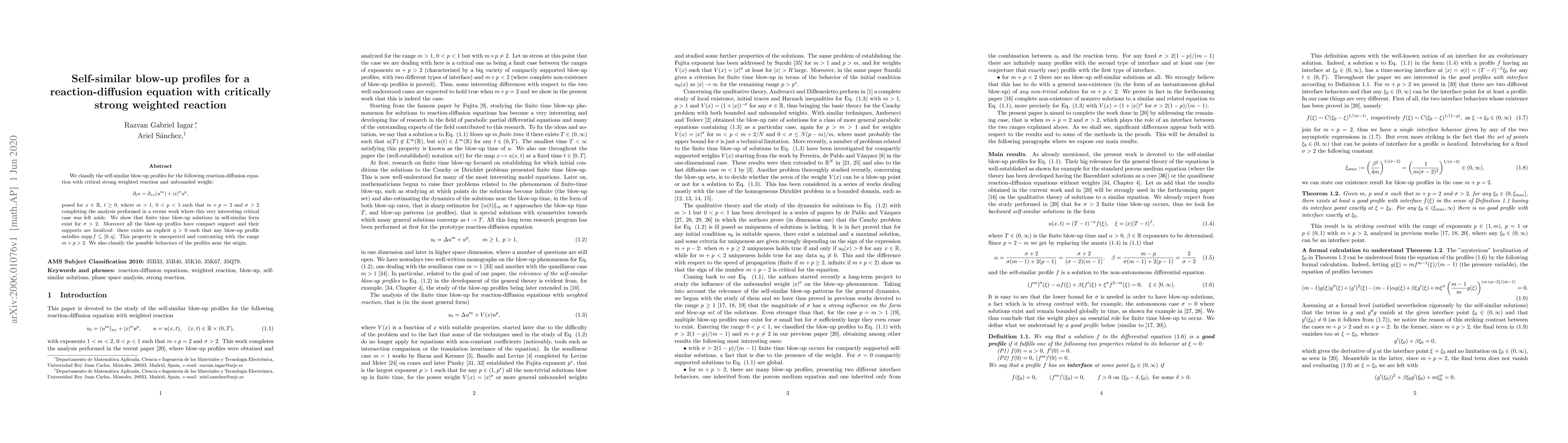 This paper classifies self-similar blow-up profiles for a reaction-diffusion equation with critical strong weighted reaction, revealing that finite time blow-up solutions exist for $\sigma>2$ and have compact, localized support within $[0,\eta]$. The study also examines the behavior of these profiles near the origin.