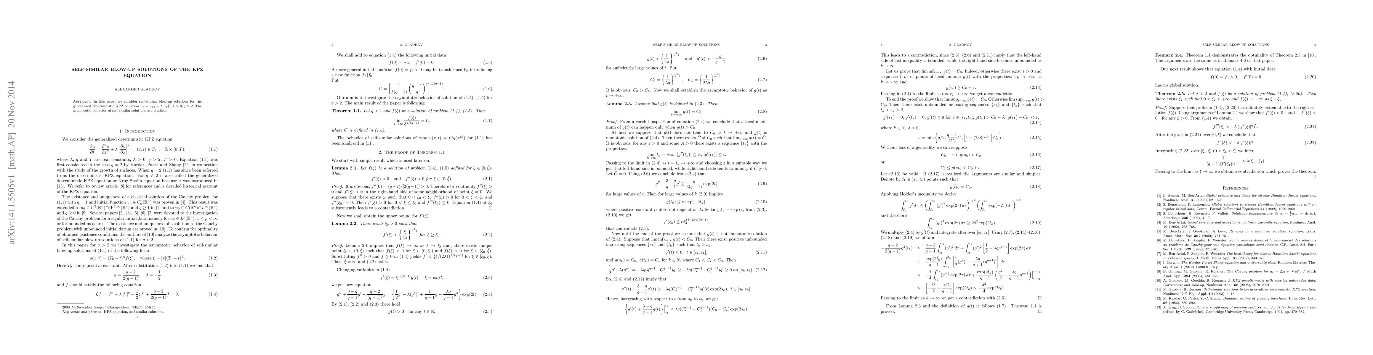 This paper investigates self-similar blow-up solutions for the generalized KPZ equation, focusing on the asymptotic behavior of these solutions. The study reveals insights into the equation's dynamics under certain parameters.