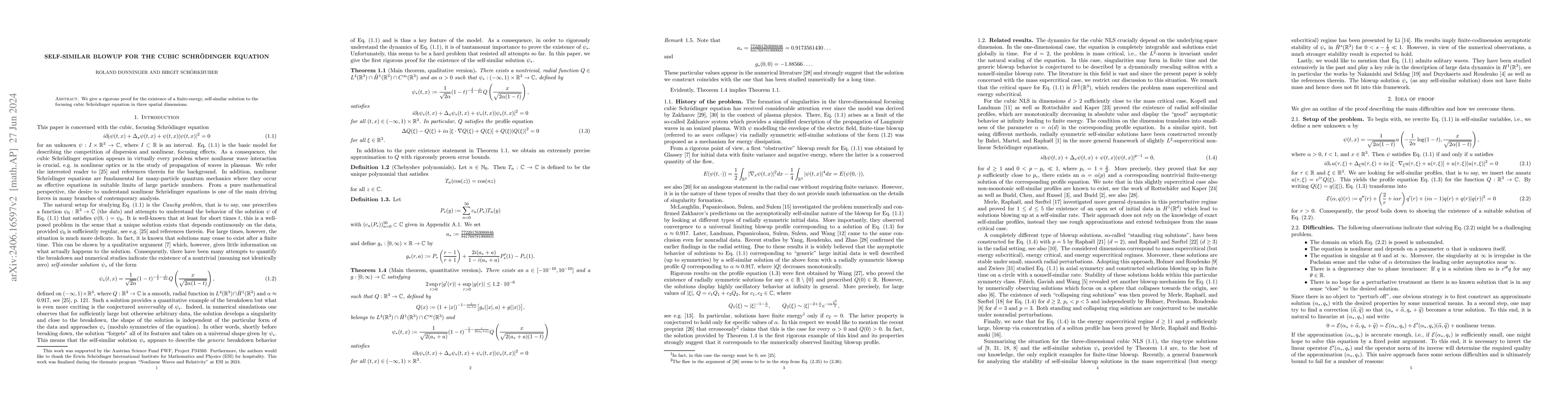This paper proves the existence of a finite-energy, self-similar blowup solution for the focusing cubic Schrödinger equation in three dimensions, demonstrating a rigorous mathematical framework for such phenomena.