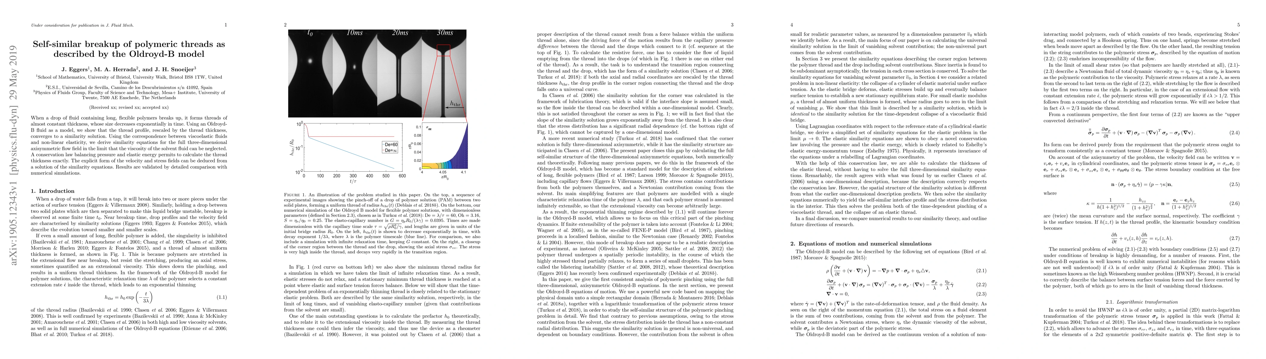 When a drop of fluid containing long, flexible polymers breaks up, it forms threads of almost constant thickness, whose size decreases exponentially in time. Using an Oldroyd-B fluid as a model, we show that the thread profile, rescaled by the thread thickness, converges to a similarity solution. Using the correspondence between viscoelastic fluids and non-linear elasticity, we derive similarity equations for the full three-dimensional axisymmetric flow field in the limit that the viscosity of the solvent fluid can be neglected. A conservation law balancing pressure and elastic energy permits to calculate the thread thickness exactly. The explicit form of the velocity and stress fields can be deduced from a solution of the similarity equations. Results are validated by detailed comparison with numerical simulations.
