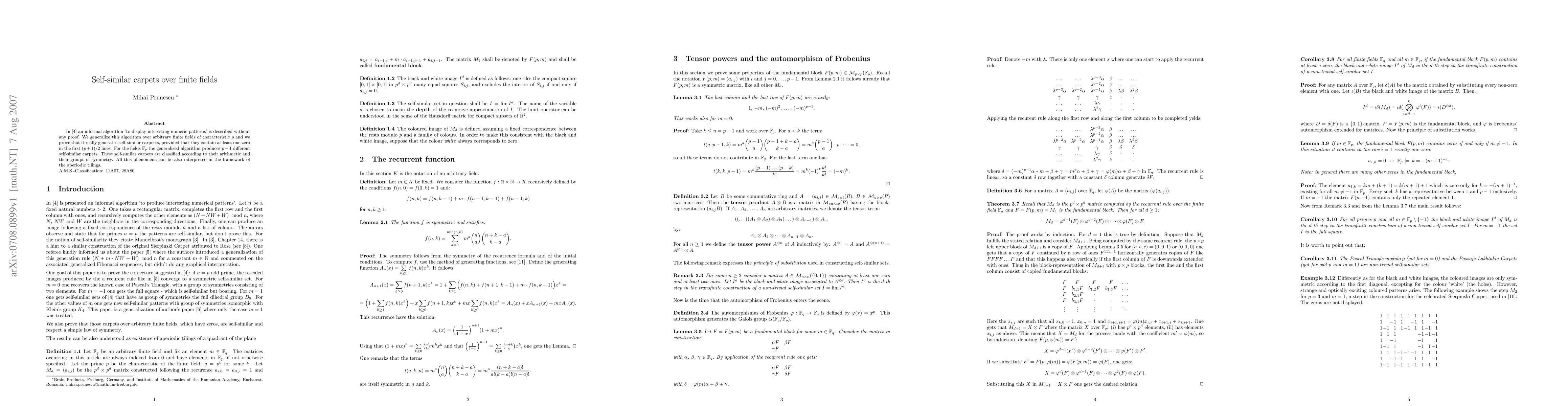 Some linear dynamical systems over finite fields are studied and the self-similar character of their development is proved. Connections with aperiodic tilings, Delanoy numbers and other topics are also proved. The prime fields F_p have a canonical presentation as sets of self-similar carpets. The multiplicative inverse corresponds to mirroring.