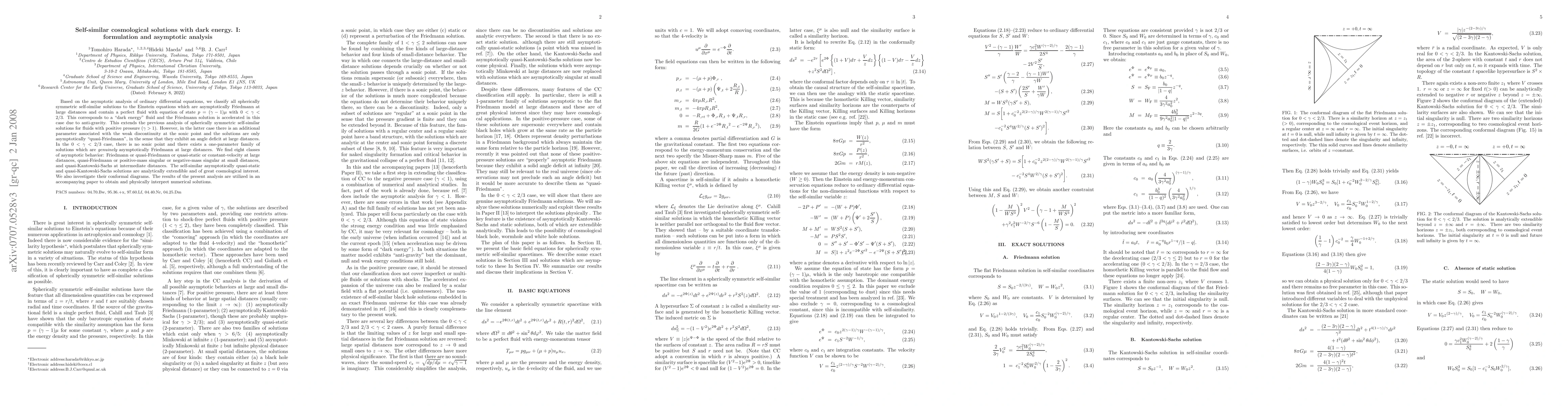 Based on the asymptotic analysis of ordinary differential equations, we classify all spherically symmetric self-similar solutions to the Einstein equations which are asymptotically Friedmann at large distances and contain a perfect fluid with equation of state $p=(\gamma -1)\mu$ with $0<\gamma<2/3$. This corresponds to a ``dark energy'' fluid and the Friedmann solution is accelerated in this case due to anti-gravity. This extends the previous analysis of spherically symmetric self-similar solutions for fluids with positive pressure ($\gamma>1$). However, in the latter case there is an additional parameter associated with the weak discontinuity at the sonic point and the solutions are only asymptotically ``quasi-Friedmann'', in the sense that they exhibit an angle deficit at large distances. In the $0<\gamma<2/3$ case, there is no sonic point and there exists a one-parameter family of solutions which are {\it genuinely} asymptotically Friedmann at large distances. We find eight classes of asymptotic behavior: Friedmann or quasi-Friedmann or quasi-static or constant-velocity at large distances, quasi-Friedmann or positive-mass singular or negative-mass singular at small distances, and quasi-Kantowski-Sachs at intermediate distances. The self-similar asymptotically quasi-static and quasi-Kantowski-Sachs solutions are analytically extendible and of great cosmological interest. We also investigate their conformal diagrams. The results of the present analysis are utilized in an accompanying paper to obtain and physically interpret numerical solutions.