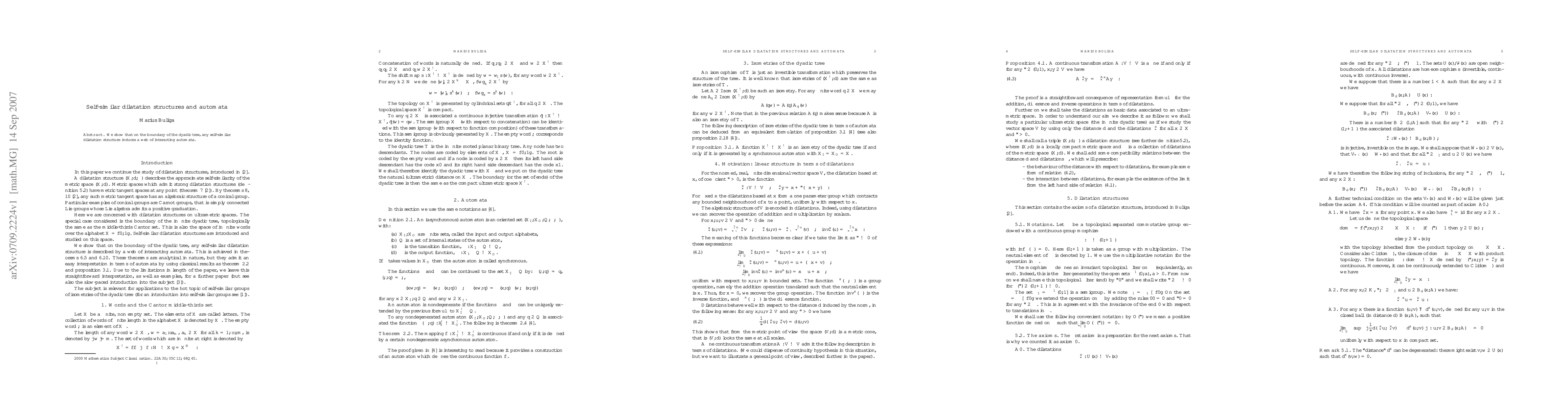 This paper demonstrates that self-similar dilatation structures on the boundary of the dyadic tree generate a network of interacting automata. The full version provides detailed mathematical proofs and deeper analysis.
