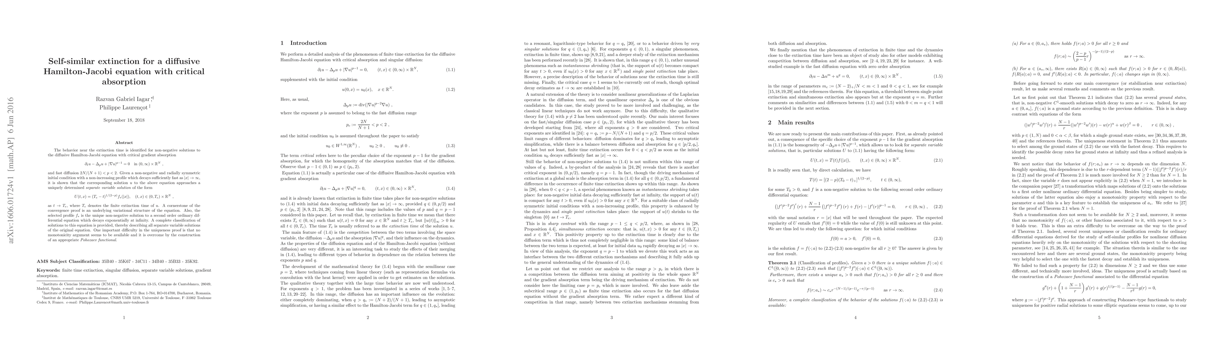 The behavior near the extinction time is identified for non-negative solutions to the diffusive Hamilton-Jacobi equation with critical gradient absorption $\partial_t u - \Delta_p u + |\nabla u|^{p-1} = 0$ in $(0, \infty) \times \mathbb{R}^N$, and fast diffusion $2N/(N + 1) < p < 2$. Given a non-negative and radially symmetric initial condition with a non-increasing profile which decays sufficiently fast as $|x| \to \infty$, it is shown that the corresponding solution $u$ to the above equation approaches a uniquely determined separate variable solution of the form $U(t, x) = (T_e - t)^{1/(2-p)} f_* (|x|), (t, x) \in (0, T_e) \times \mathbb{R}^N$, as $t \to T_e$, where $T_e$ denotes the finite extinction time of $u$. A cornerstone of the convergence proof is an underlying variational structure of the equation. Also, the selected profile $f_*$ is the unique non-negative solution to a second order ordinary differential equation which decays exponentially at infinity. A complete classification of solutions to this equation is provided, thereby describing all separate variable solutions of the original equation. One important difficulty in the uniqueness proof is that no monotonicity argument seems to be available and it is overcome by the construction of an appropriate Pohozaev functional.