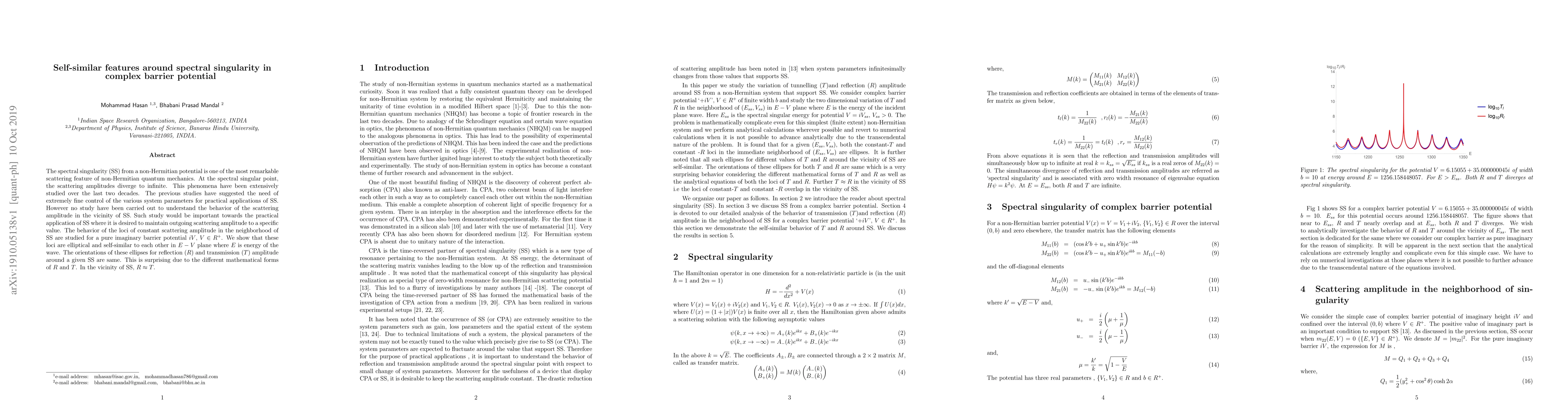 Researchers studied the behavior of scattering amplitudes near spectral singularities in complex barrier potentials, finding that loci of constant amplitude form elliptical shapes that are self-similar and exhibit symmetry between reflection and transmission amplitudes.