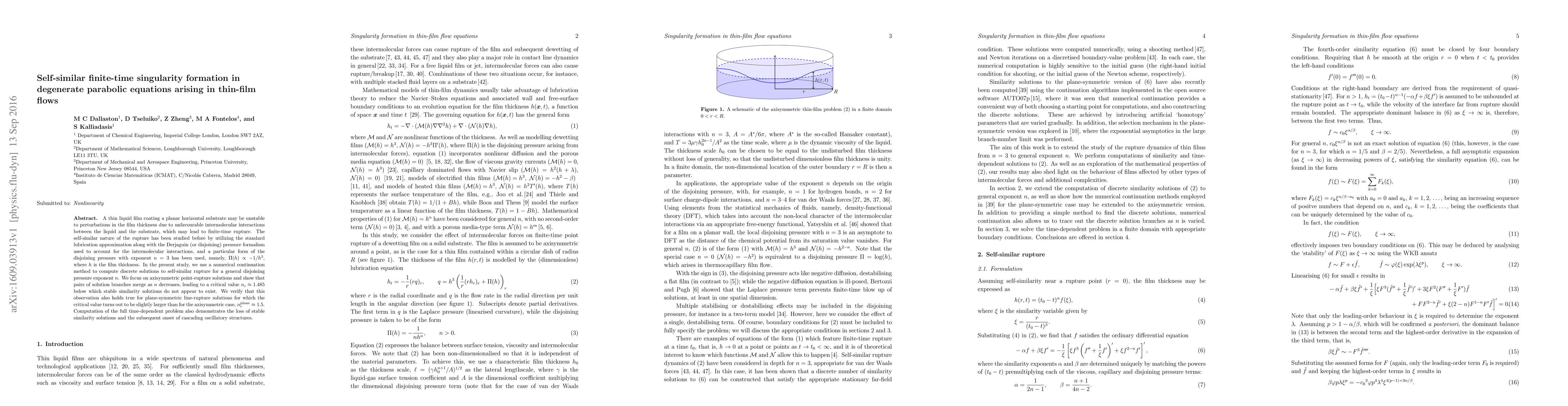 This paper investigates the self-similar rupture of thin liquid films using numerical continuation methods, finding that stable similarity solutions cease to exist below a critical disjoining pressure exponent $n_c \approx 1.485$ for axisymmetric ruptures and $n_c^{\mathrm{plane}} \approx 1.5$ for plane-symmetric ruptures, leading to finite-time singularity formation.