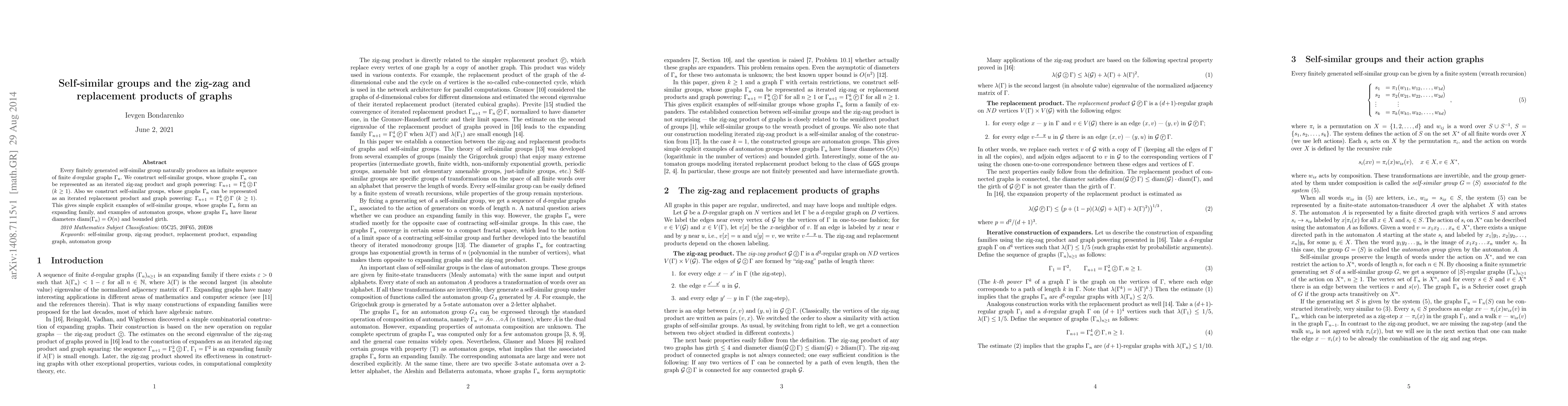 This paper constructs self-similar groups generating sequences of finite $d$-regular graphs $\Gamma_n$ via zig-zag and replacement products, showing that $\Gamma_{n+1}$ can be expressed as $\Gamma_n^k\mathop{\mbox{\textcircled{$z$}}}\Gamma$ or $\Gamma_n^k\mathop{\mbox{\textcircled{$r$}}}\Gamma$ ($k\geq 1$), with $\Gamma_n$ forming an expanding family and having linear diameters and bounded girth.