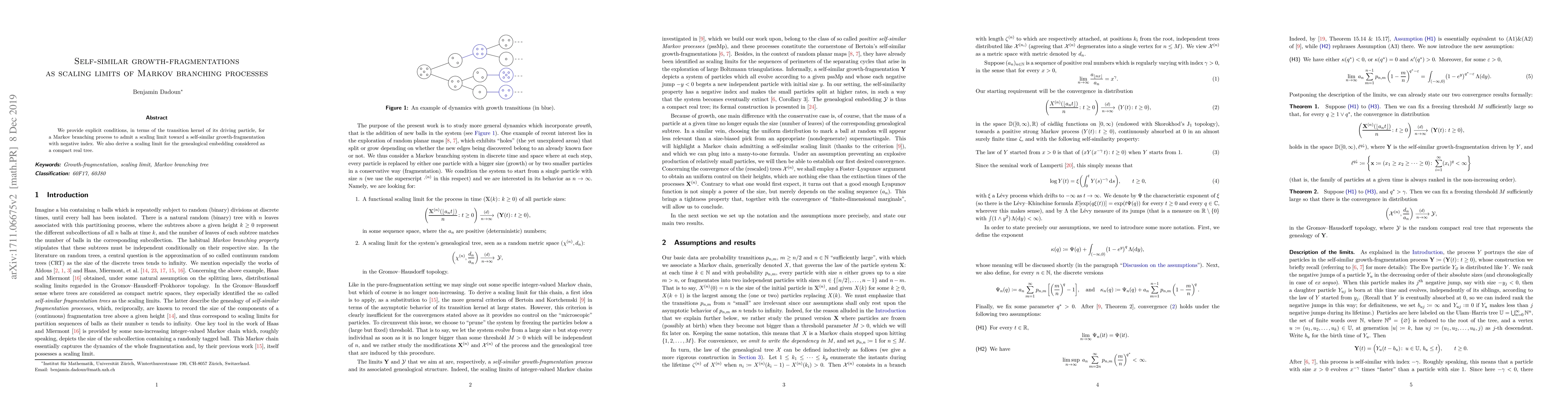 Summary: This paper establishes conditions for Markov branching processes to converge to self-similar growth-fragmentation processes, and it also derives a scaling limit for the genealogical embedding as a compact real tree.