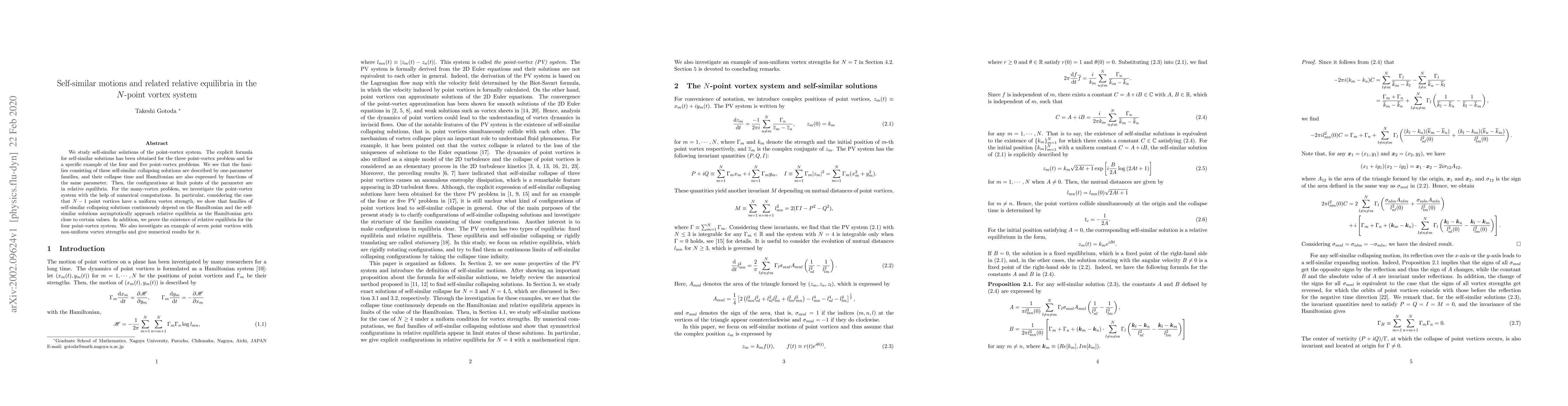 The research derives explicit formulas for self-similar solutions in point-vortex systems, identifying one-parameter families of collapsing solutions. For N-vortex systems, numerical computations reveal continuous dependence on Hamiltonian, with self-similar solutions approaching relative equilibria as Hamiltonian nears specific values. The study proves relative equilibria for the four-vortex system and presents numerical results for a seven-vortex system with non-uniform strengths.