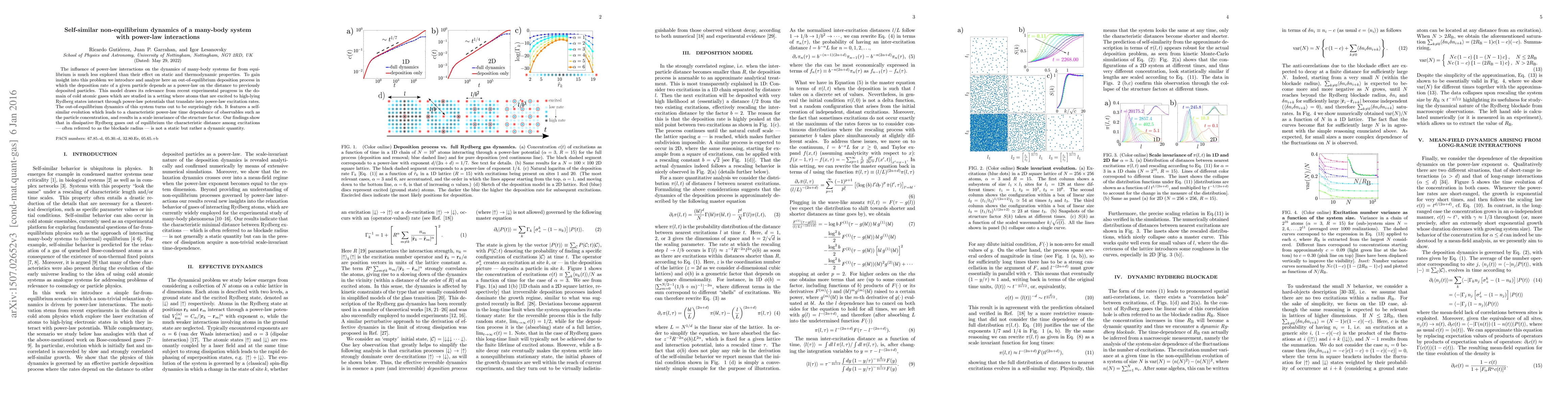 This paper investigates the self-similar non-equilibrium dynamics of many-body systems with power-law interactions, revealing a rich out-of-equilibrium deposition process characterized by a power-law dependence on particle distances. The study finds a dynamic blockade radius and scale invariance in the structure factor, highlighting the complexity of such systems.