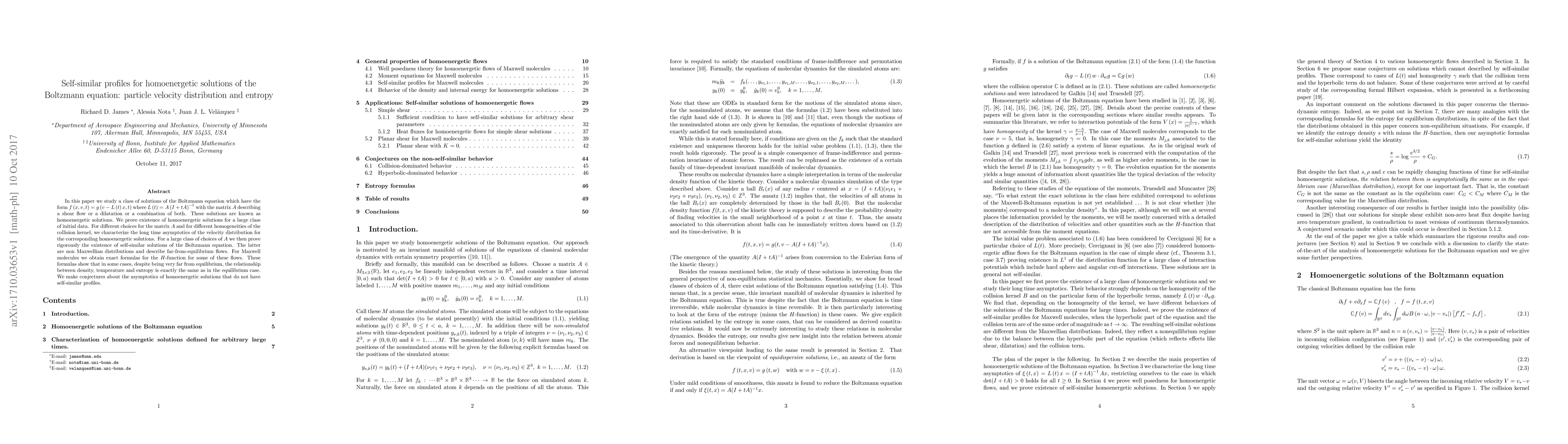 This paper investigates homoenergetic solutions of the Boltzmann equation, proving their existence for various initial conditions and characterizing their long-time velocity distributions. It rigorously establishes the existence of self-similar, non-Maxwellian solutions describing far-from-equilibrium flows, and provides exact formulas for the $H$-function under certain conditions, revealing surprising equilibrium-like entropy relationships.