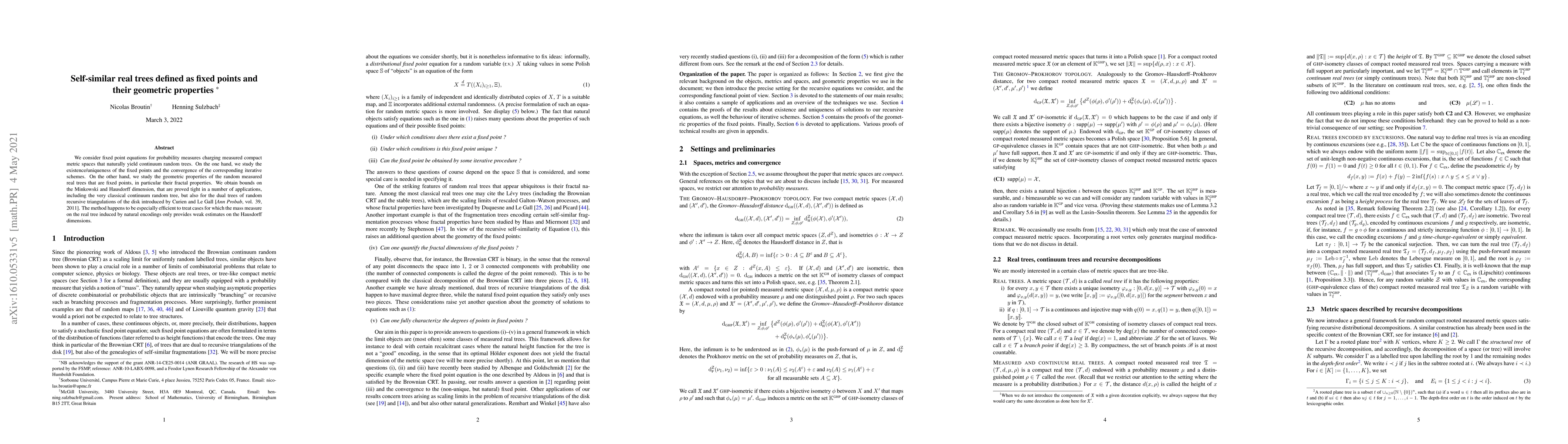 We consider fixed-point equations for probability measures charging measured compact metric spaces that naturally yield continuum random trees. On the one hand, we study the existence/uniqueness of the fixed-points and the convergence of the corresponding iterative schemes. On the other hand, we study the geometric properties of the random measured real trees that are fixed-points, in particular their fractal properties. We obtain bounds on the Minkowski and Hausdorff dimension, that are proved tight in a number of applications, including the very classical continuum random tree, but also for the dual trees of random recursive triangulations of the disk introduced by Curien and Le Gall [Ann Probab, vol. 39, 2011]. The method happens to be especially efficient to treat cases for which the mass measure on the real tree induced by natural encodings only provides weak estimates on the Hausdorff dimension.